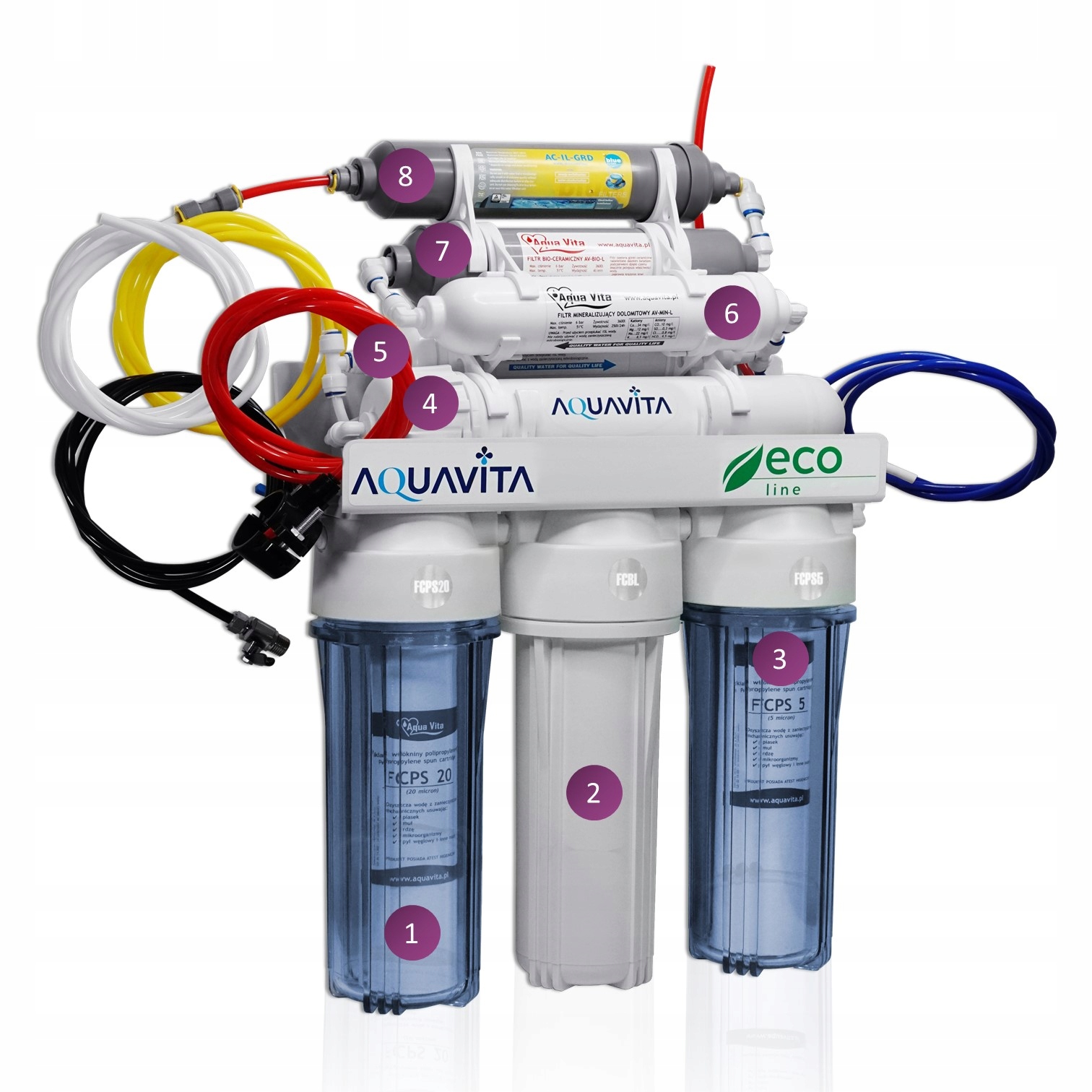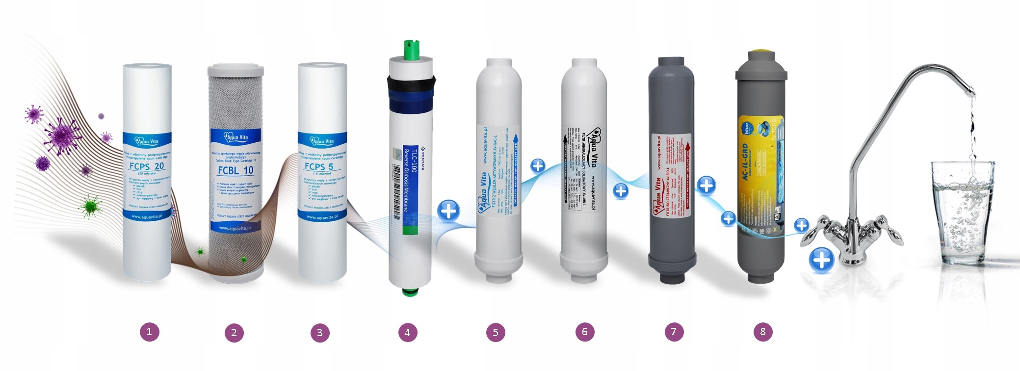 Вода, що протікає через цю систему, проходить 8 ступенів фільтрації:
