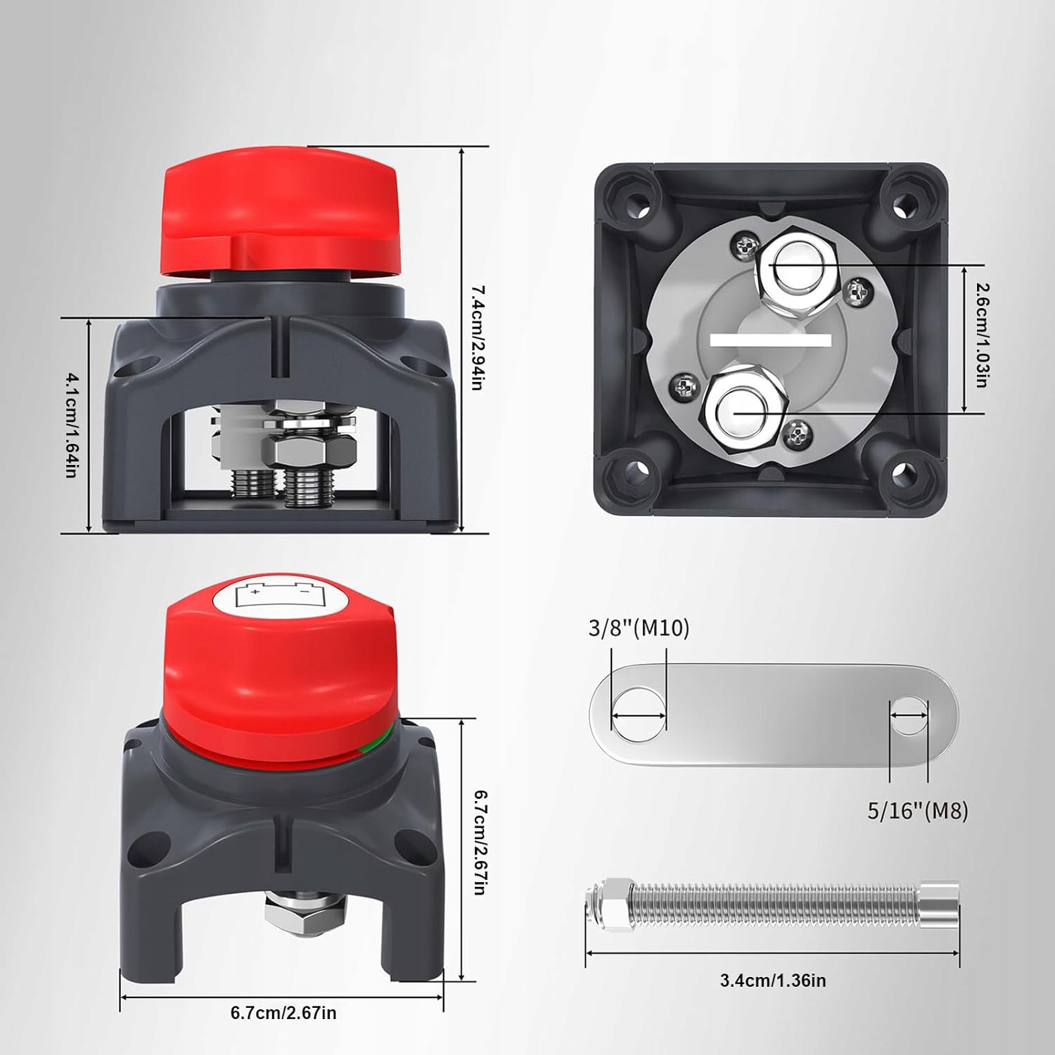 Цей 12 В -комутатор акумулятора має положення/вимкнення 2; Номінальні параметри: 275 постійний постійний струм (1 година), 455 та постійний струм (5 хв.), 1250 A DC Start -up (10 секунд). Розмір зберігання: 2х3/8 "(10 мм) підтримує різні з'єднання електричної установки.