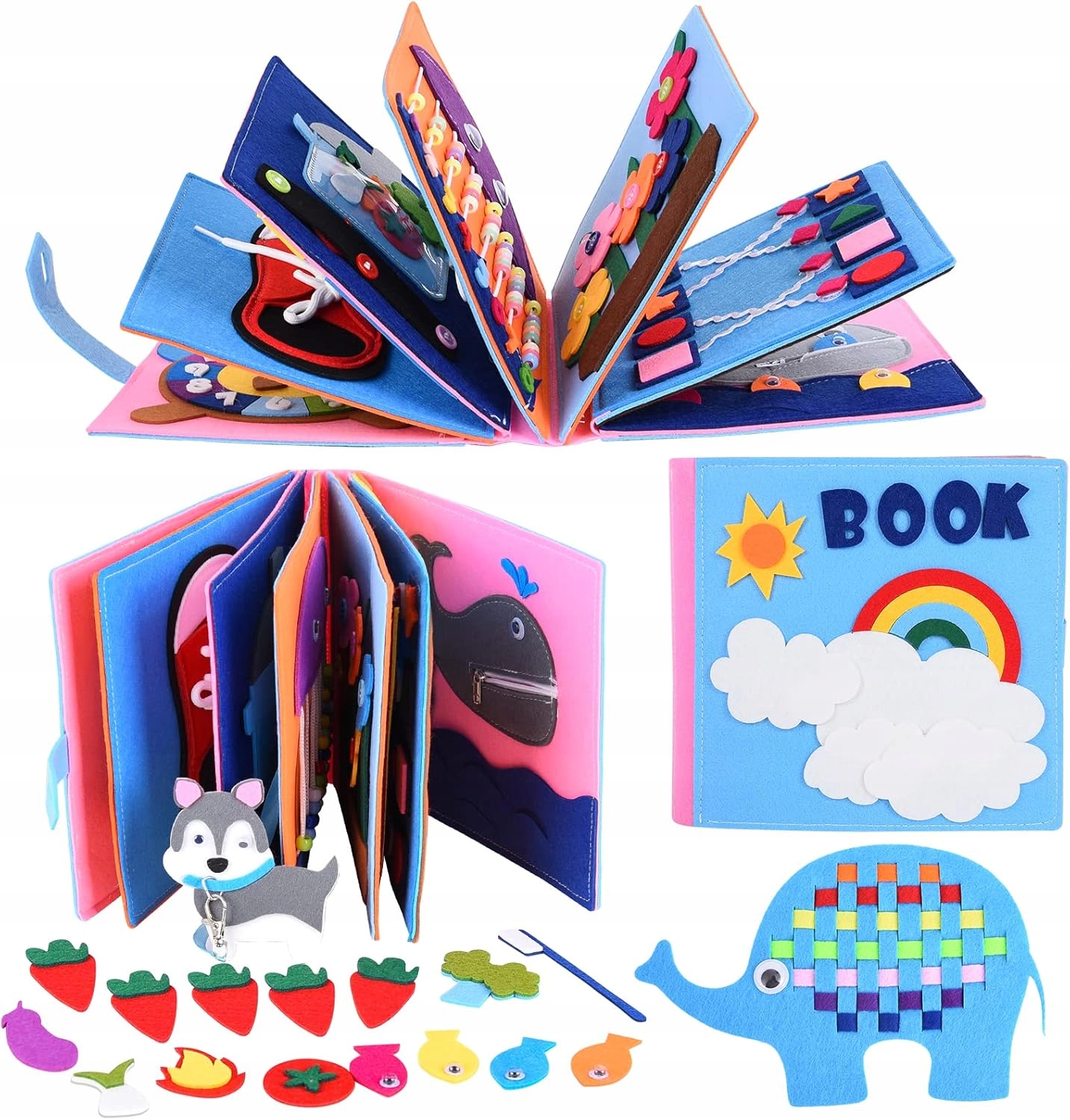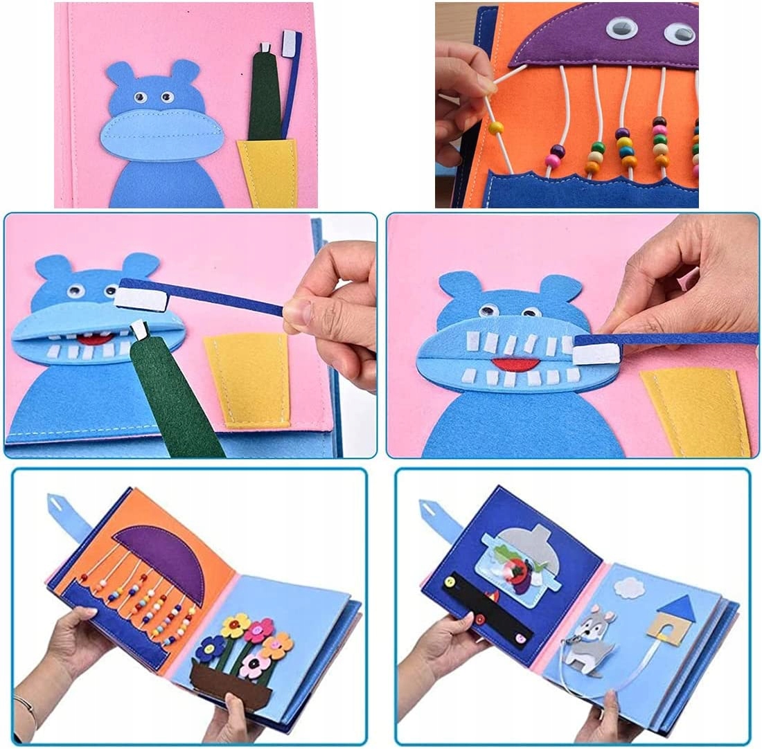 Фетрова буклет має багато функцій, таких як намотування, шнурки, годинник, погода, миття гіпопотама зубів, пластина під тиском, барвиста головоломка, грає, грає відповідність і тягнуть моркву.