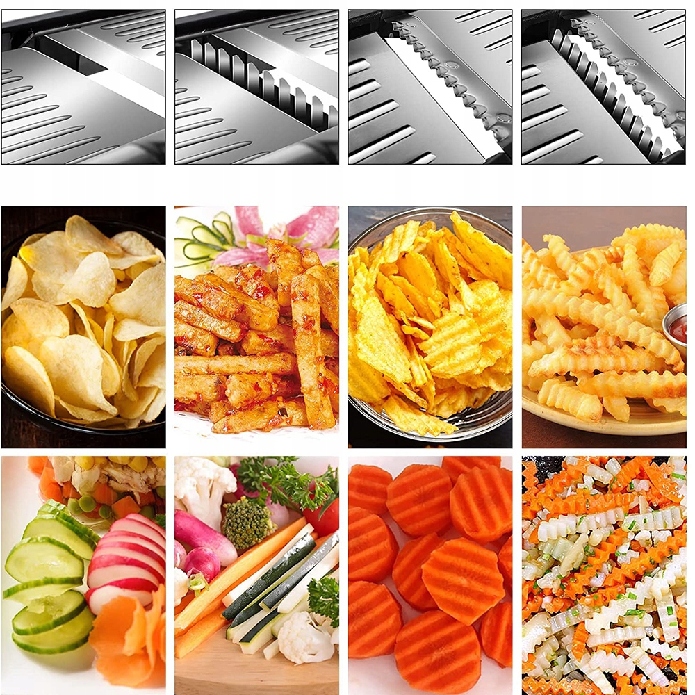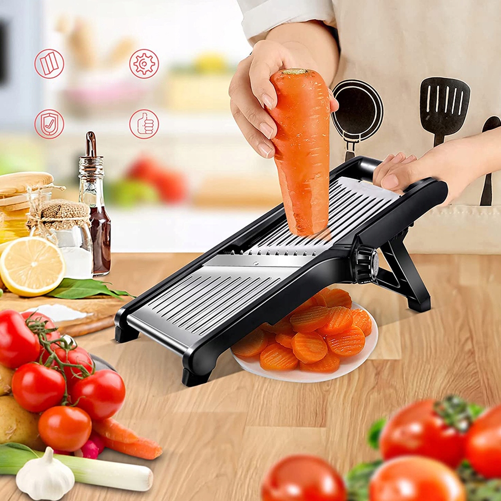 🍆 -леза, що забезпечують чисте різання всіх видів їжі. Суцільна конструкція, яка запобігає легкому вигину та деформації. Товщину можна відрегулювати від дуже тонкого до 9 мм. Ручка анти -свердловини є ергономічною і забезпечує зручне зчеплення.