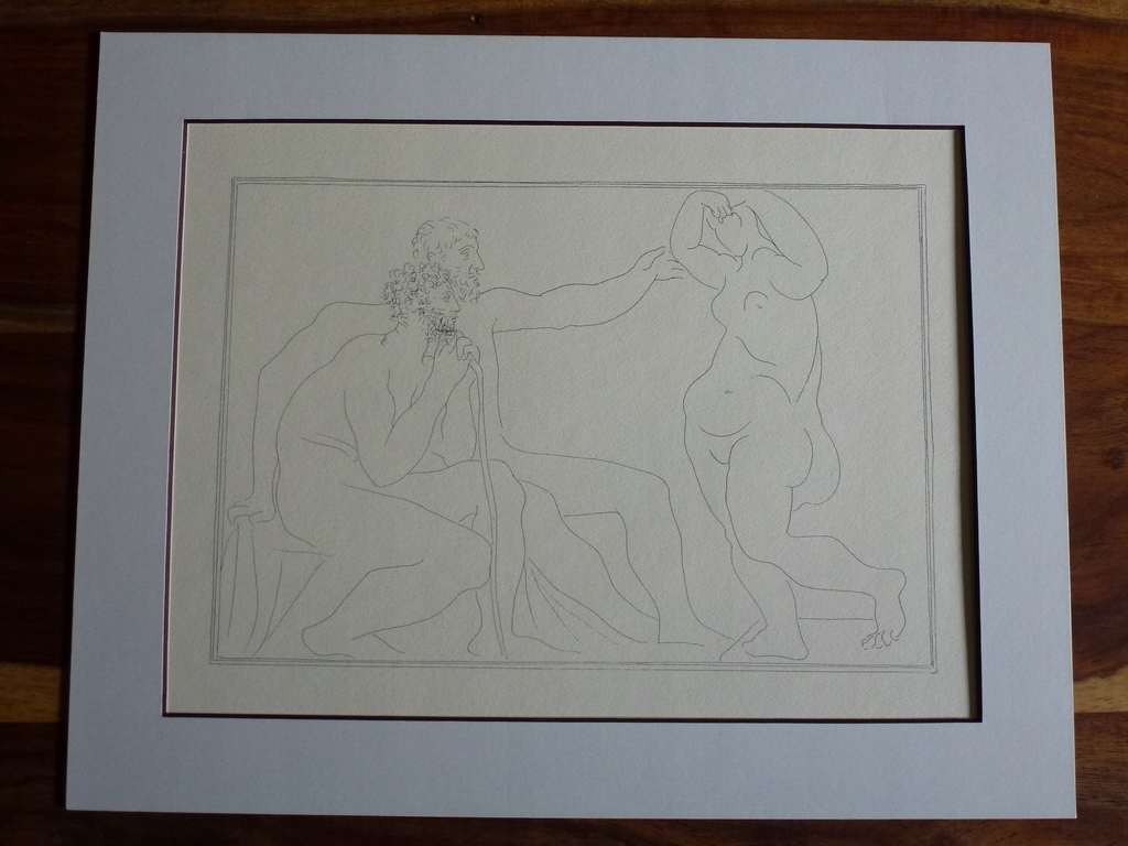 Я повинен запропонувати ілюстрацію Пабло Пікассо (1881-1973), опублікованій Гердом Хатже, Штутгарт із серії "Suite Vollard", видання, опубліковане під час життя художника та згоди в 1956 р. на папері, обрамленому в Passe-partout, підготовленому для попереднього кадру. Усі наступні фотографії зроблені мною та показують справжню умову об'єкта. Рекомендую.