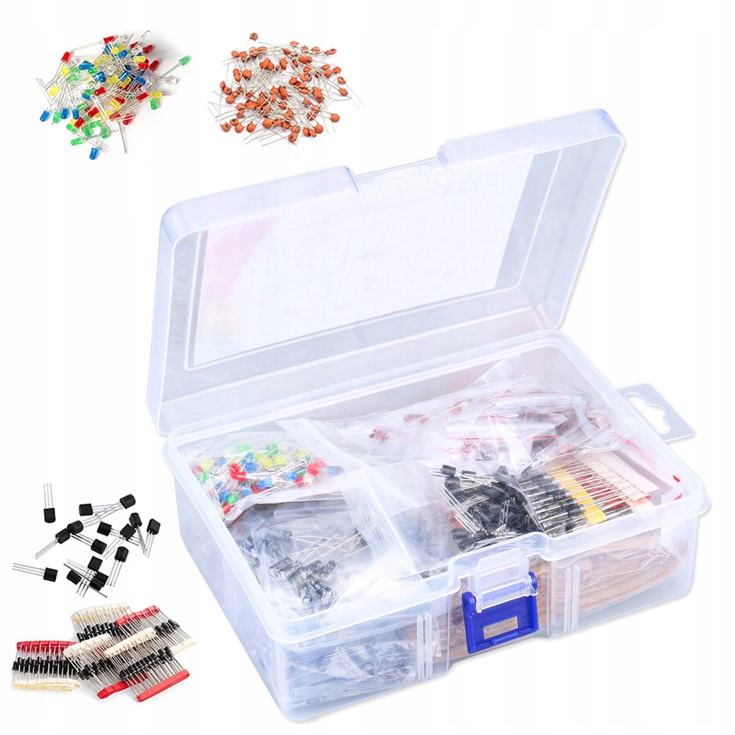 12 типів електролітичних конденсаторів, 30 типів керамічних конденсаторів, 8 типів звичайних діодів, 5 видів світлодіодів, 8 видів транзисторів, 30 типів металізованих резисторів. Усі упаковані в поліетиленовий пакет.