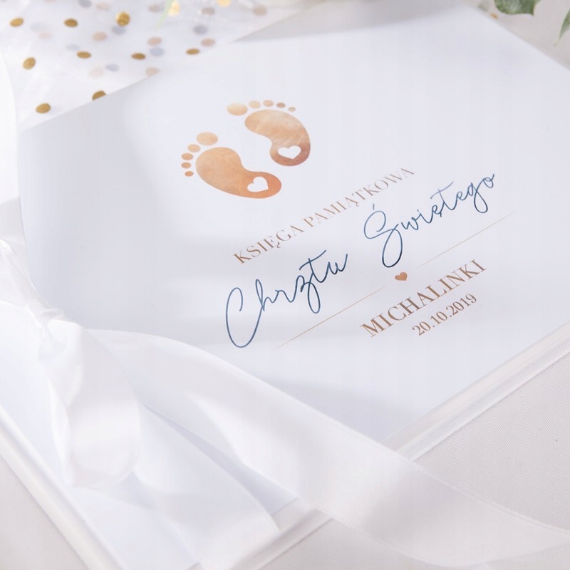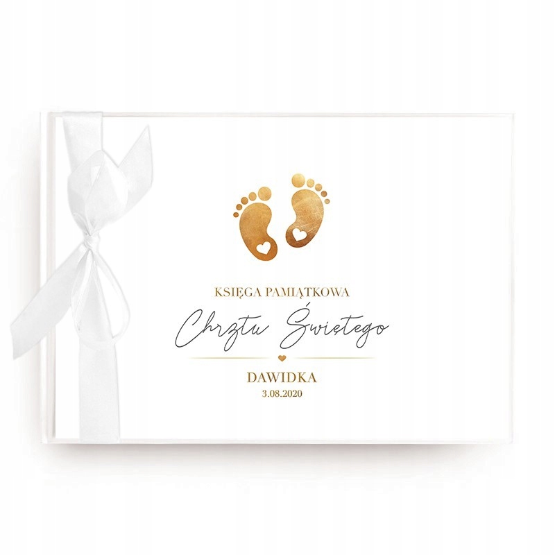 Книга Хрещення - це унікальний сувенір, який дозволить вам згадати про такий важливий і прекрасний день, як Хрещення дитини. У ньому аж 100 білих сторінок, які завдяки записам, побажанням і фотографіям ваших гостей створять унікальний сувенір для вашого малюка. Обкладинка була прикрашена красивим блискучим мотивом із золотими ногами та ім’ям дитини та датою святкування. Все це виглядає красиво і елегантно. Книгу також можна використовувати як альбом для фотографій з церемонії.