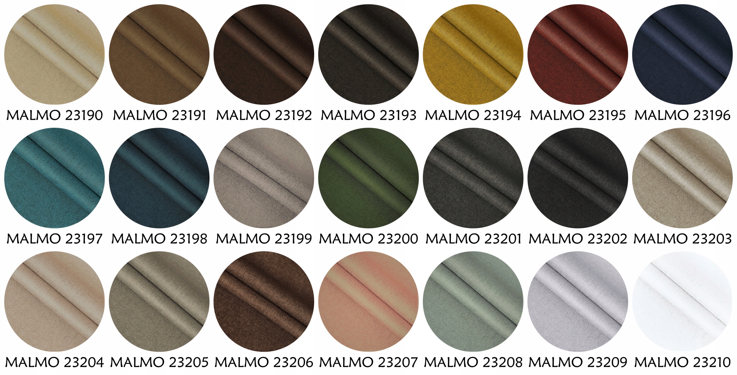 Тканина MALMO стійка до стирання, дуже довговічна та міцна, і водночас надзвичайно м'яка та приємна на дотик . Він доступний у широкому, природному діапазоні кольорів: від сірого, через коричневий, до пастельних. Він має дуже ніжну, але помітну структуру, яка в багатьох кольорах підкреслюється неоднорідним кольором, отриманим завдяки переплетенню двох кольорів.