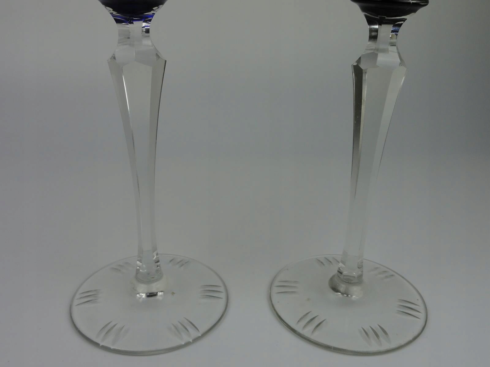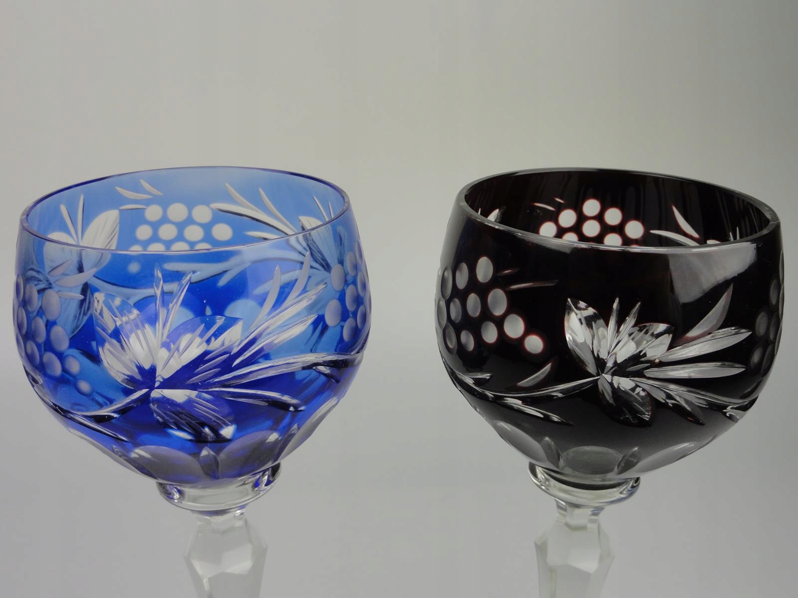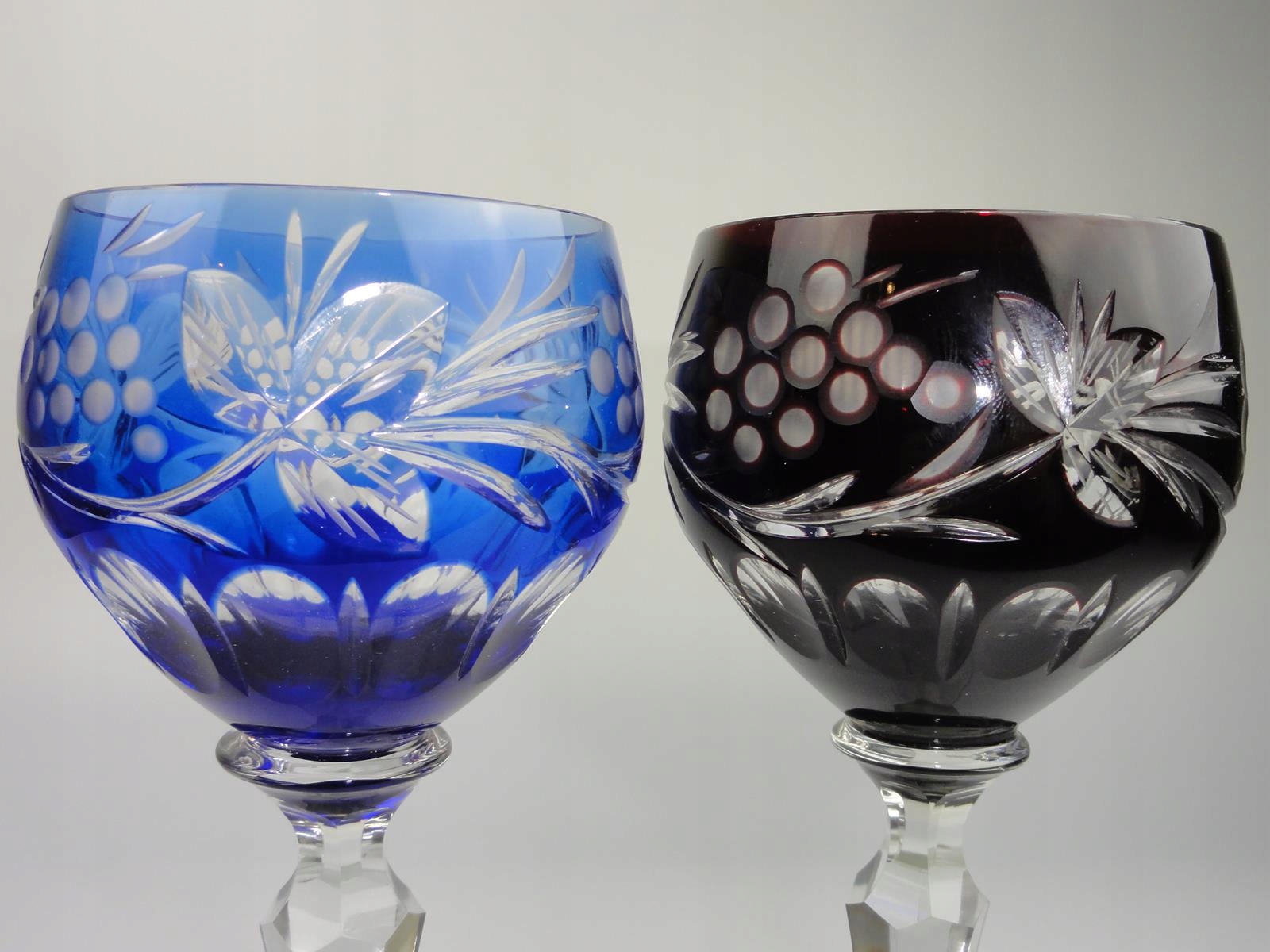 *келихи зі свинцевого скла, видувного у формі, гранованого та полірованого, блакитне та рубінове покриття, стовпчастий древко, різана ніжка,