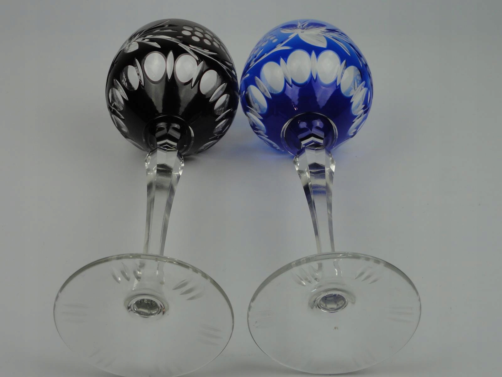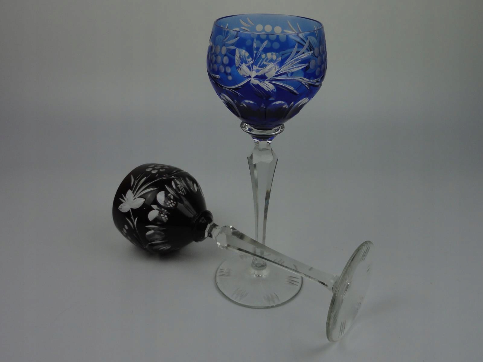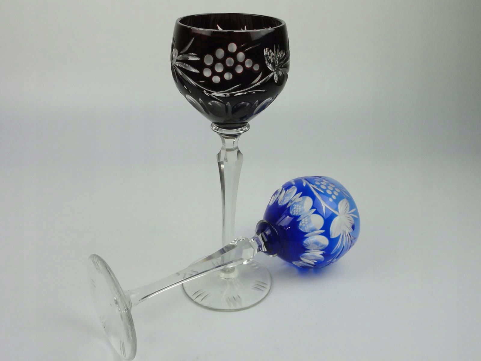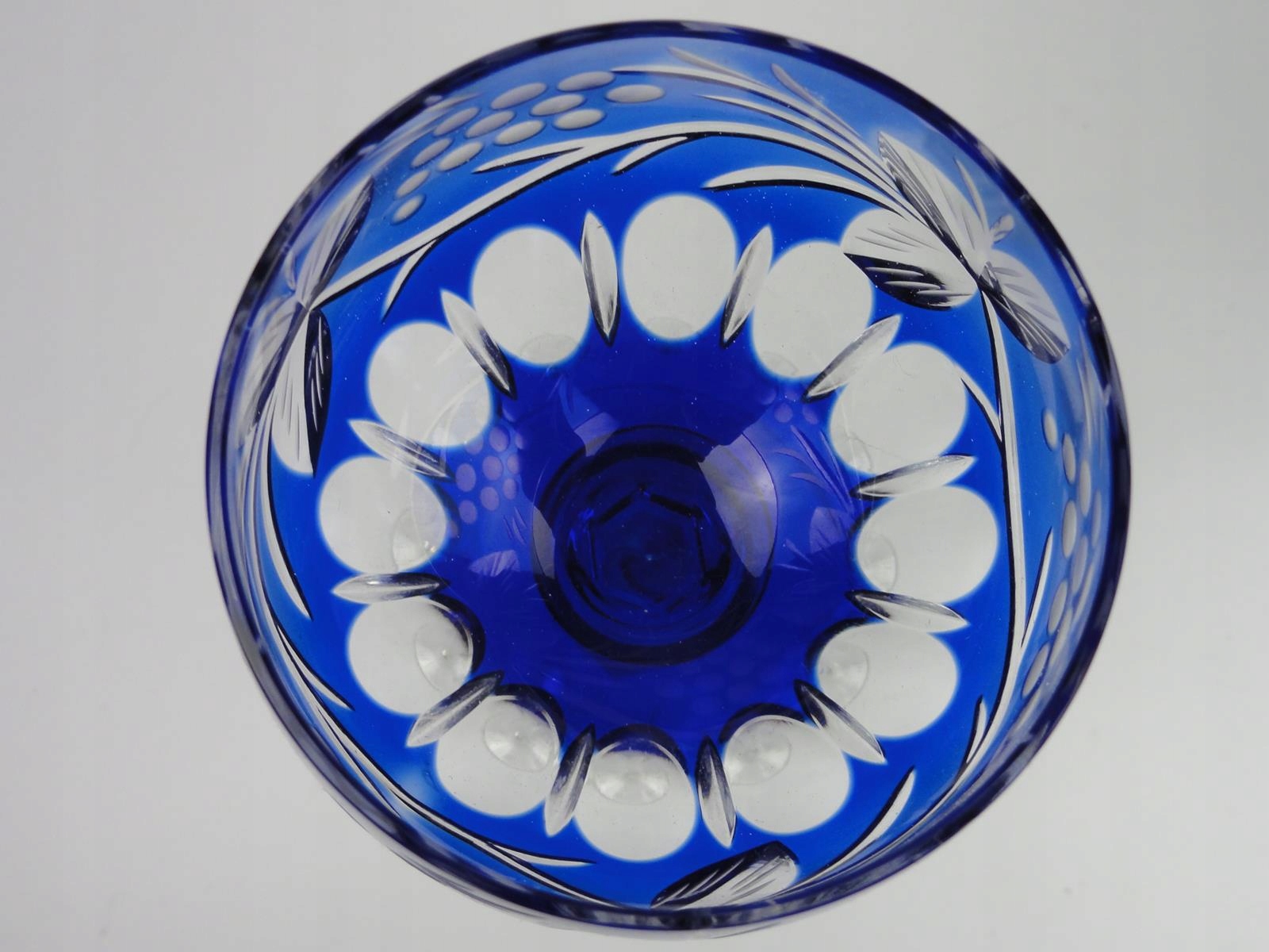 *келихи зі свинцевого скла, видувного у формі, гранованого та полірованого, блакитне та рубінове покриття, стовпчастий древко, різана ніжка,