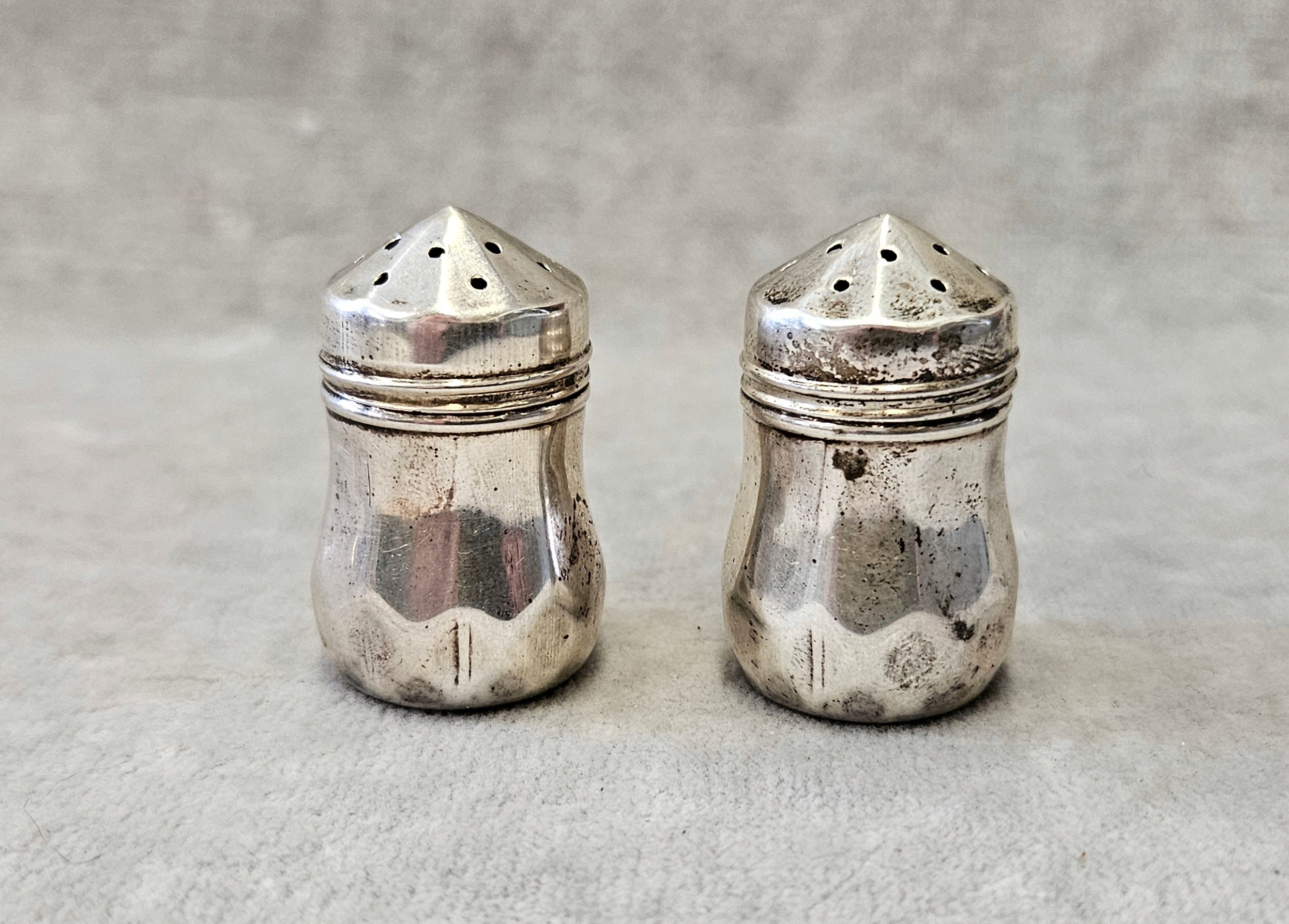 Сільська пара солі. срібний пр. 925. Стерлінг, вага 7,4 г. Висота 3,8 див. Середній показник 4,5 см. Натуральний стерлінг В.Л. Невеликий соляний шейкер і перець
