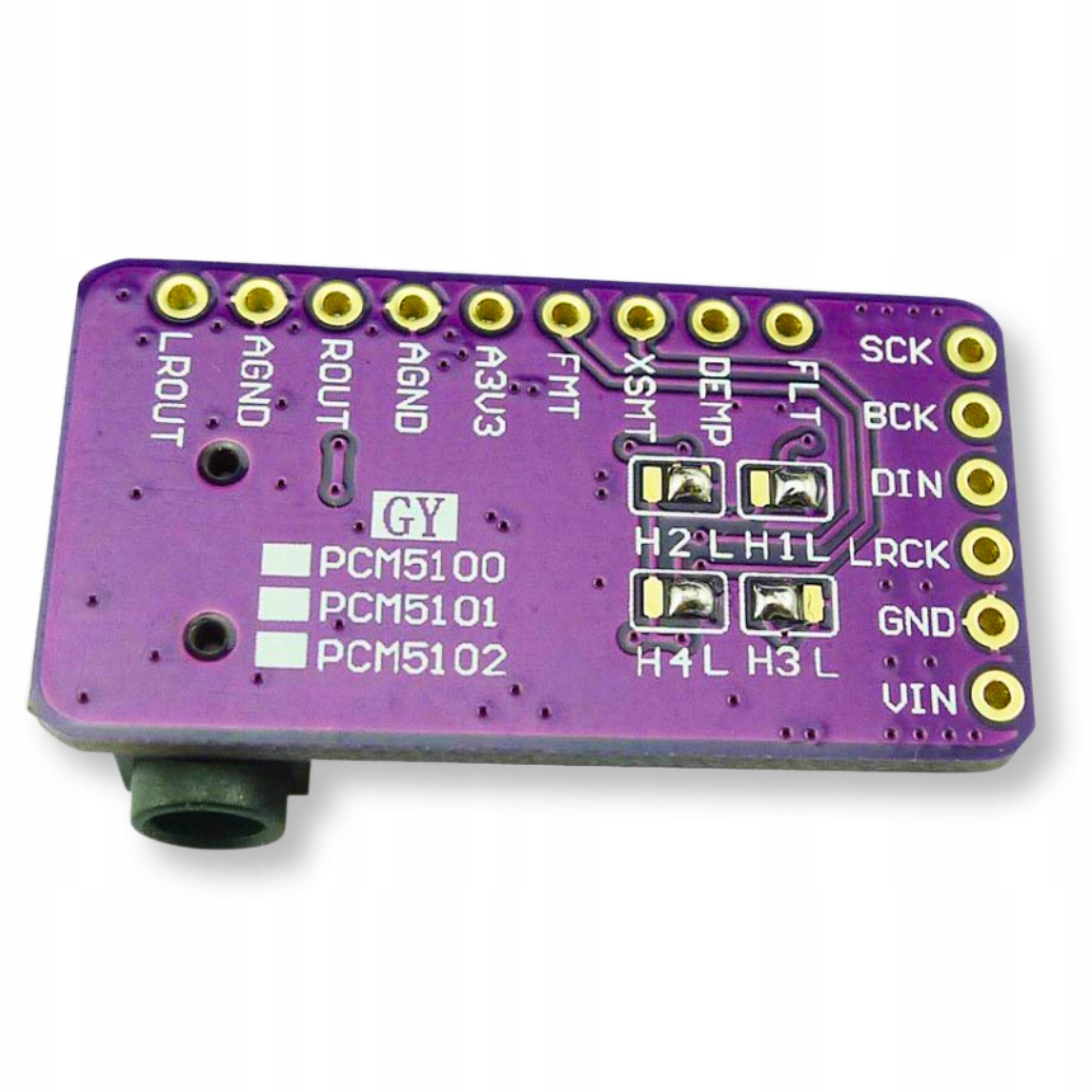 Модуль DAC PCM5102A має паяльні поля (H1L, H2L, H3L, H4L) для конфігурації режимів роботи та фільтрів PCM5102. За замовчуванням він доставляється без конфігурації кораблів. Конфігурація пружини дозволяє адаптувати операцію системи DAC до конкретних вимог аудіо -застосування.