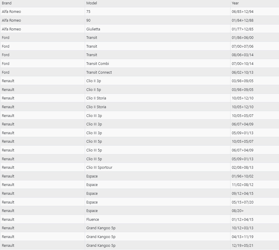 Колодки підходять до моделей, указаних у таблиці нижче: