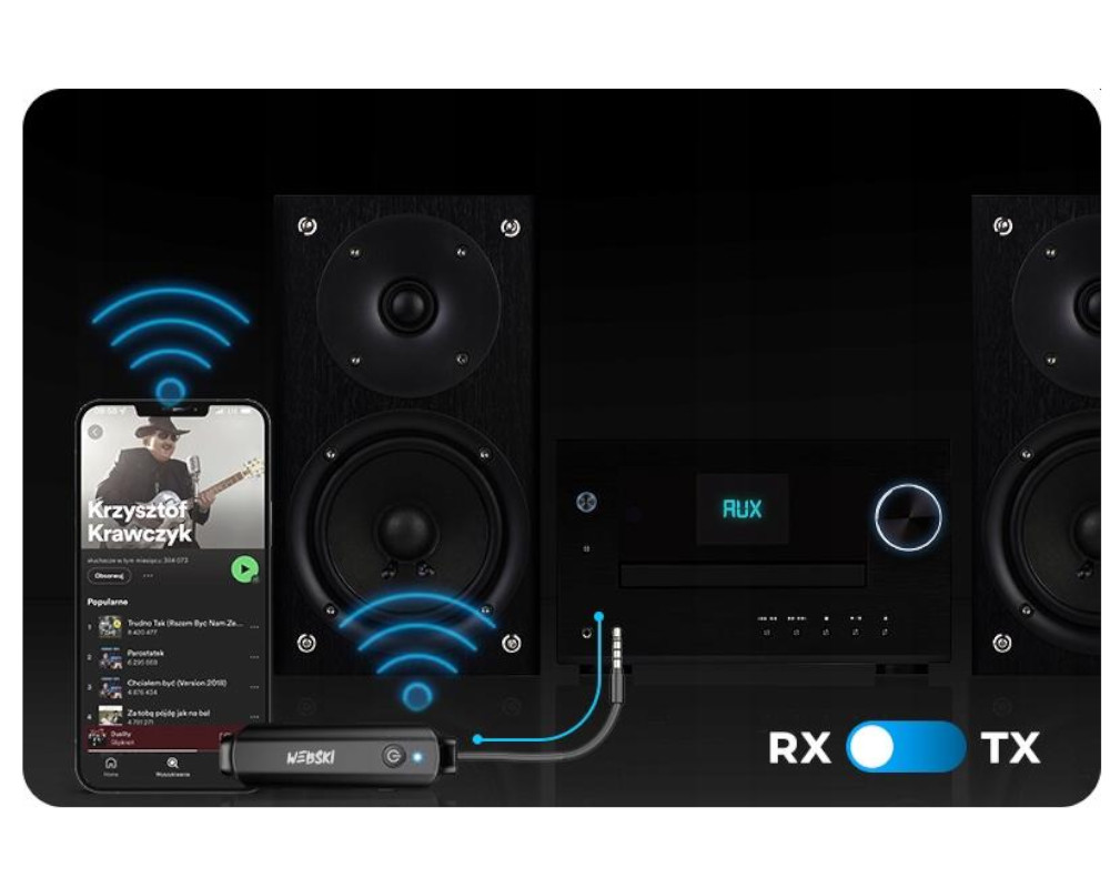 Функція TX дозволяє розширити будь-який пристрій за допомогою роз’єму 3,5 мм або 2x Chinch аудіовиходу за допомогою функції бездротової передачі. Завдяки цьому рішенню ви можете передавати сигнал, наприклад, від телевізора на бездротові навушники або бездротову аудіосистему.