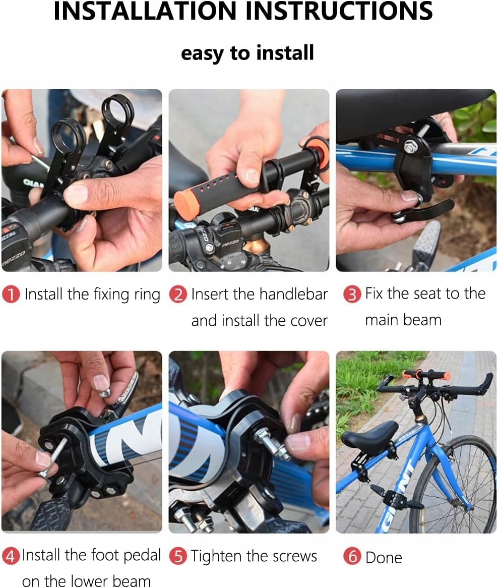 - Широке застосування. підходить для велосипедів з рамкою, такими як гірські велосипеди, дорожні велосипеди тощо (діаметр рами під сідлом близько 20-40 мм, діаметр рами під підставкою близько 40-60 мм, діаметром рульового колеса близько 20-30 мм) <встановлення. включає сидіння, ручки, педалі та необхідні аксесуари. Це дуже просто, і ви можете це зробити швидко, дотримуючись інструкцій. Швидкий роз'єм для велосипедного сідла, що дозволяє встановити клопоту: Набір включає ключ, який дозволяє встановити/розбирати за 90 секунд.