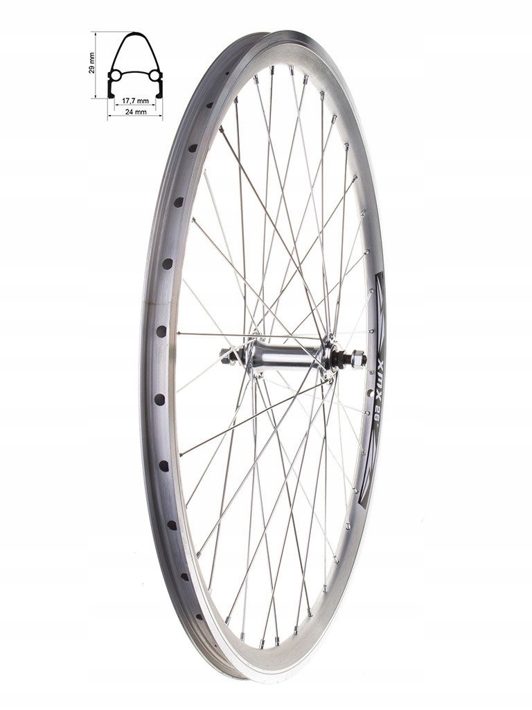 Переднє колесо 28", срібний конічний обід XMX, алюмінієва втулка з картриджними підшипниками + гайки