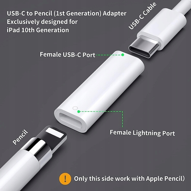 Адаптер USB-C – Pencil Lightning із Bluetooth, який дозволяє об’єднати iPencil 1 із iPad 10-го покоління. (Якщо ваш Pencil був розряджений протягом тривалого часу, будь ласка, спочатку під’єднайте Pencil до свого старого Pad або порту Lightning iPhone приблизно на 5 хвилин, щоб повторно активувати його, а потім скористайтеся цим адаптером, щоб зарядити та створити пару.)