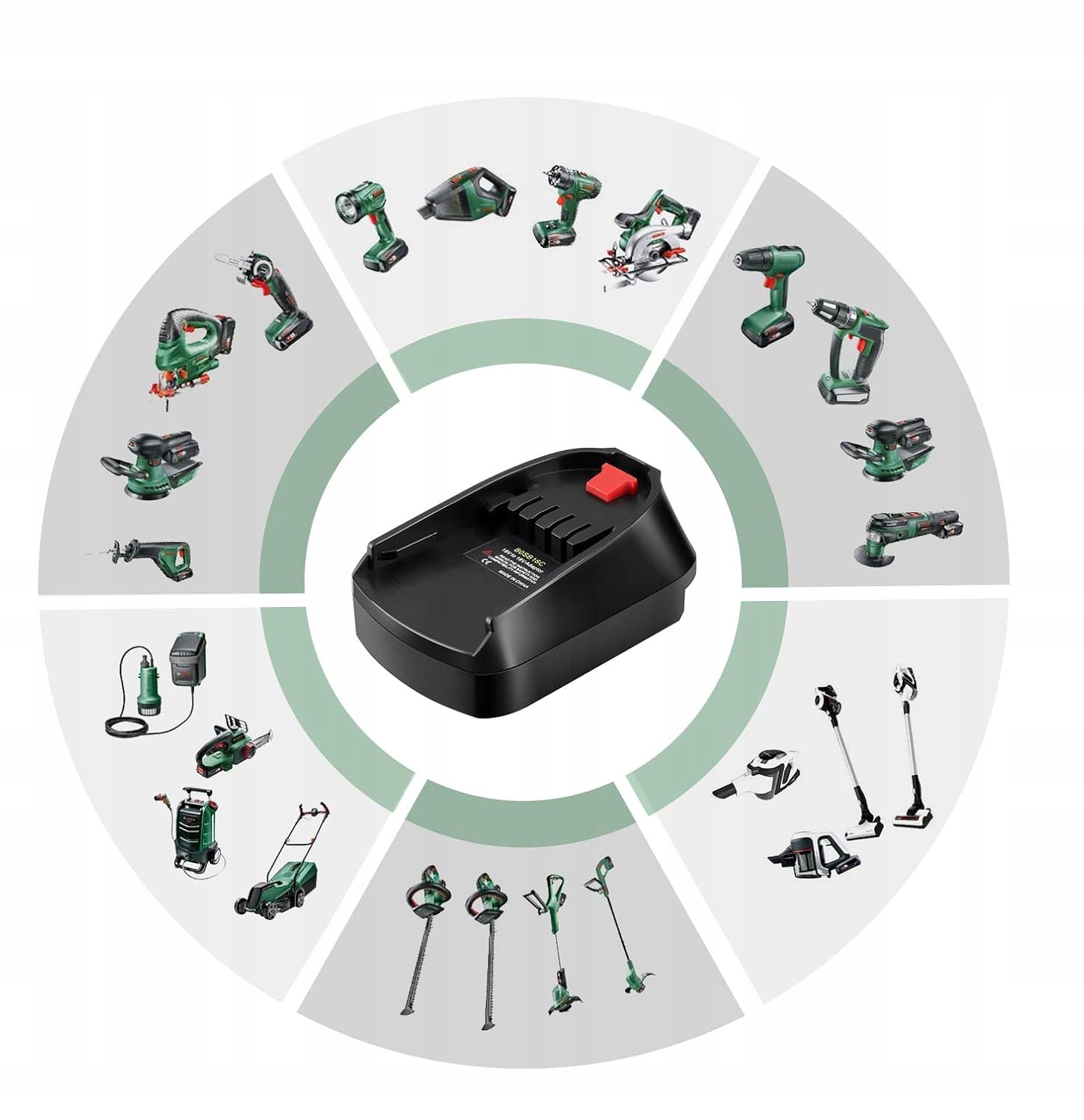 - Адаптер для: літієвої батареї Bosch 18 В, BAT607, BAT614, BAT614G, BAT622, BAT609, BAT618G, BAT609G, BAT618 тощо.