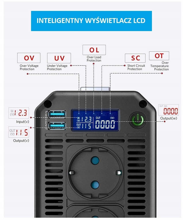 Цифровий РК-дисплей - може відображати вхідну/вихідну напругу та вихідну потужність, а також захистити дисплей у потрібний час, щоб ви могли керувати робочим станом інвертора.