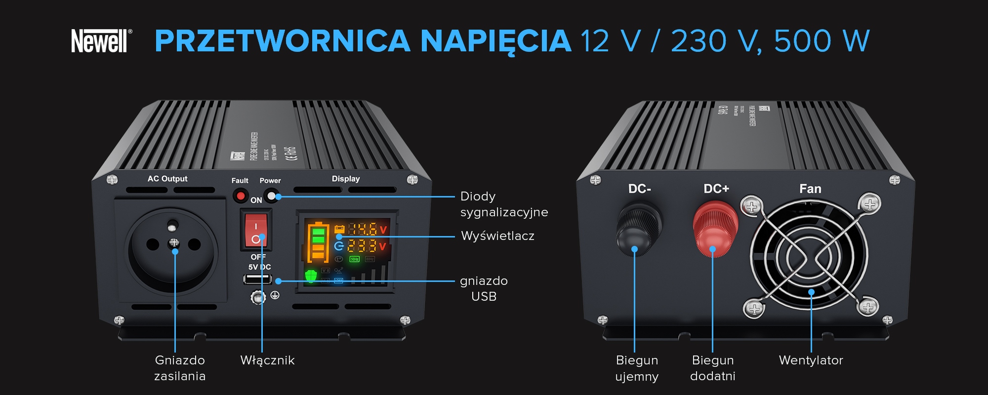 - модель: перетворювач напруги Newell із чистою синусоїдою - 12 В / 230 В, 500 Вт