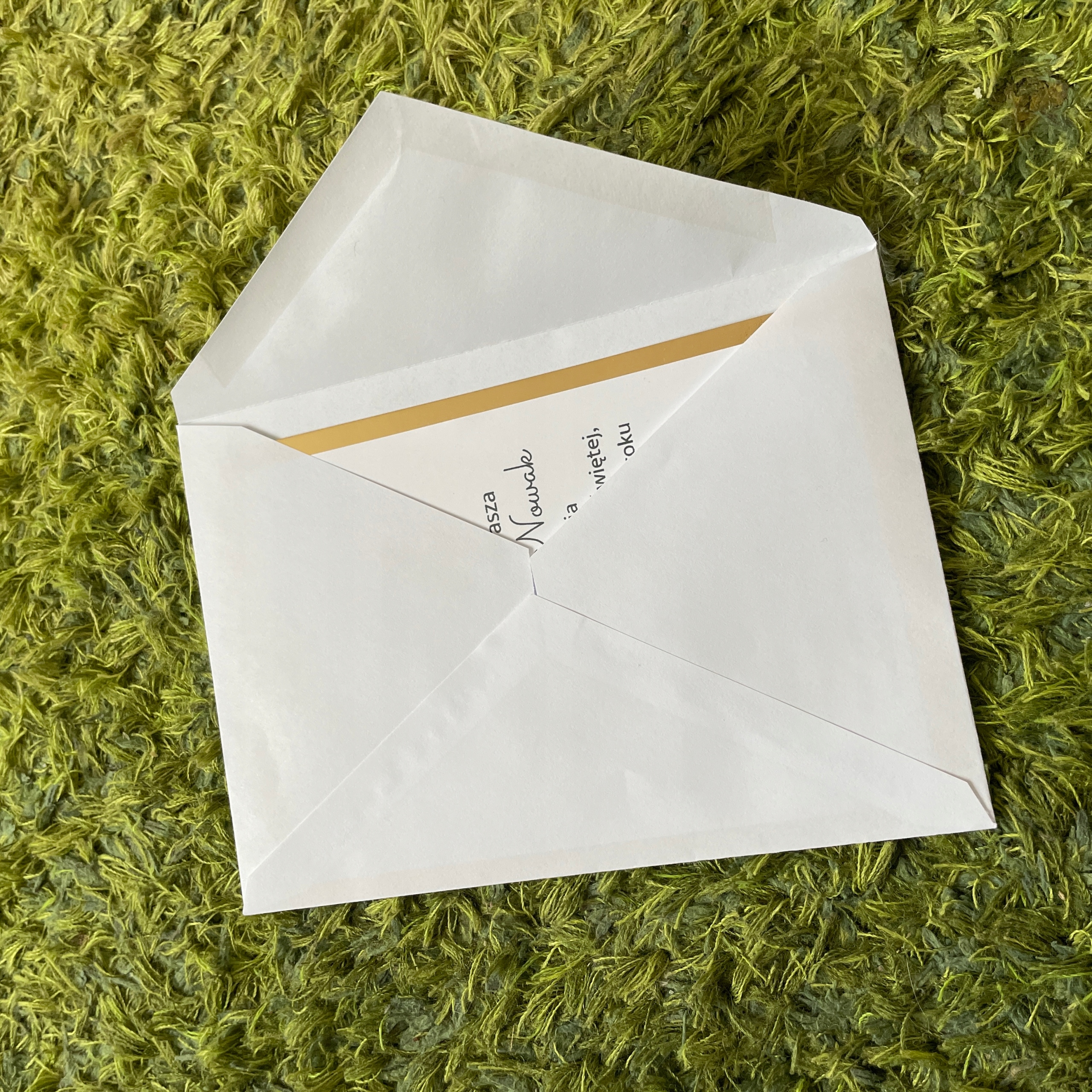 Запрошення виготовлено на білому папері та наклеєно на дзеркальний золотистий папір щільністю 250 г/м2, що робить запрошення жорстким.