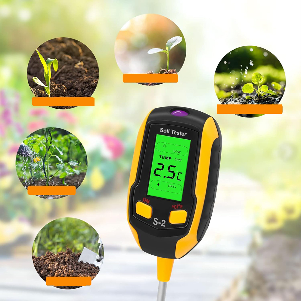 - Ви можете виміряти його за допомогою сонячного світла (9 рівнів), вологи ґрунту (5 рівнів), рН ґрунту (12 рівнів) та температурою (° C і ° F).