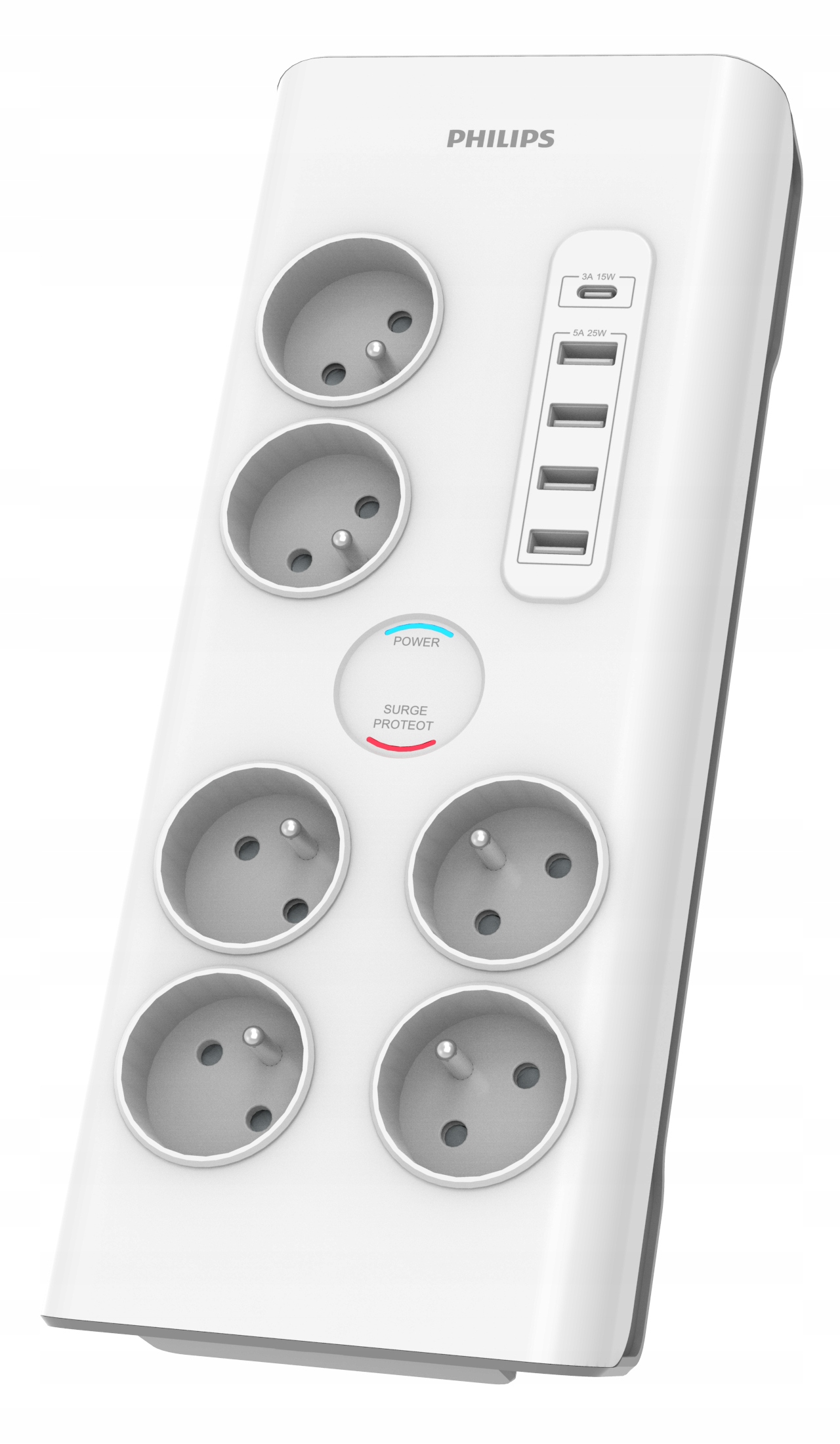 , оснащений 6 заземленими розетками. Інтегрована зарядка USB на мобільні пристрої 35 Вт. Розроблений для захисту пристроїв від сплеску. Автоматично вимикає системну пропозицію для захисту від сплеску. Технічні дані