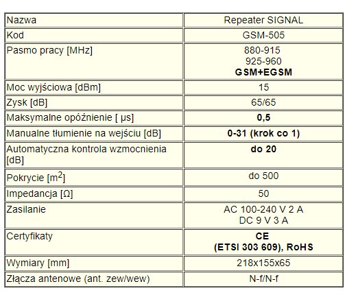 Підсилювач (повторювач) SIGNAL GSM-505 — споживчий пристрій, що підсилює весь діапазон GSM+EGSM, відповідає вимогам директиви RED 2014/53/EU та стандарту ETSI 303 609. Пристрій має декларацію CE.