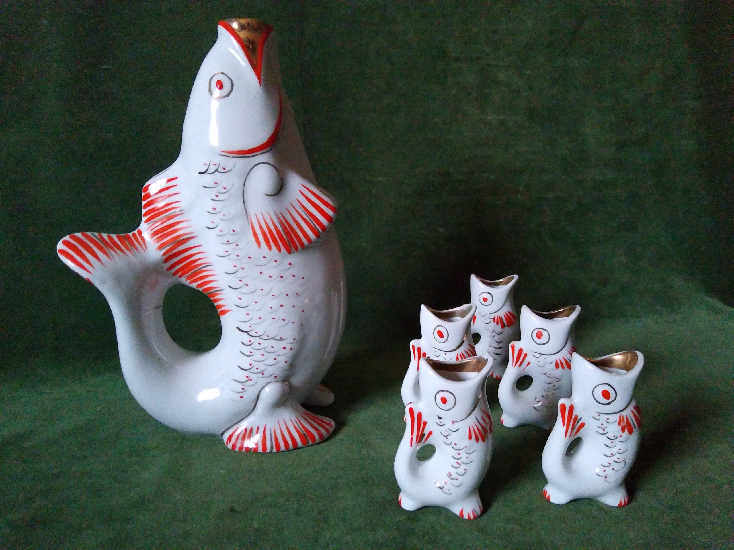 Piękna stara karafka ryba + 5 kieliszków