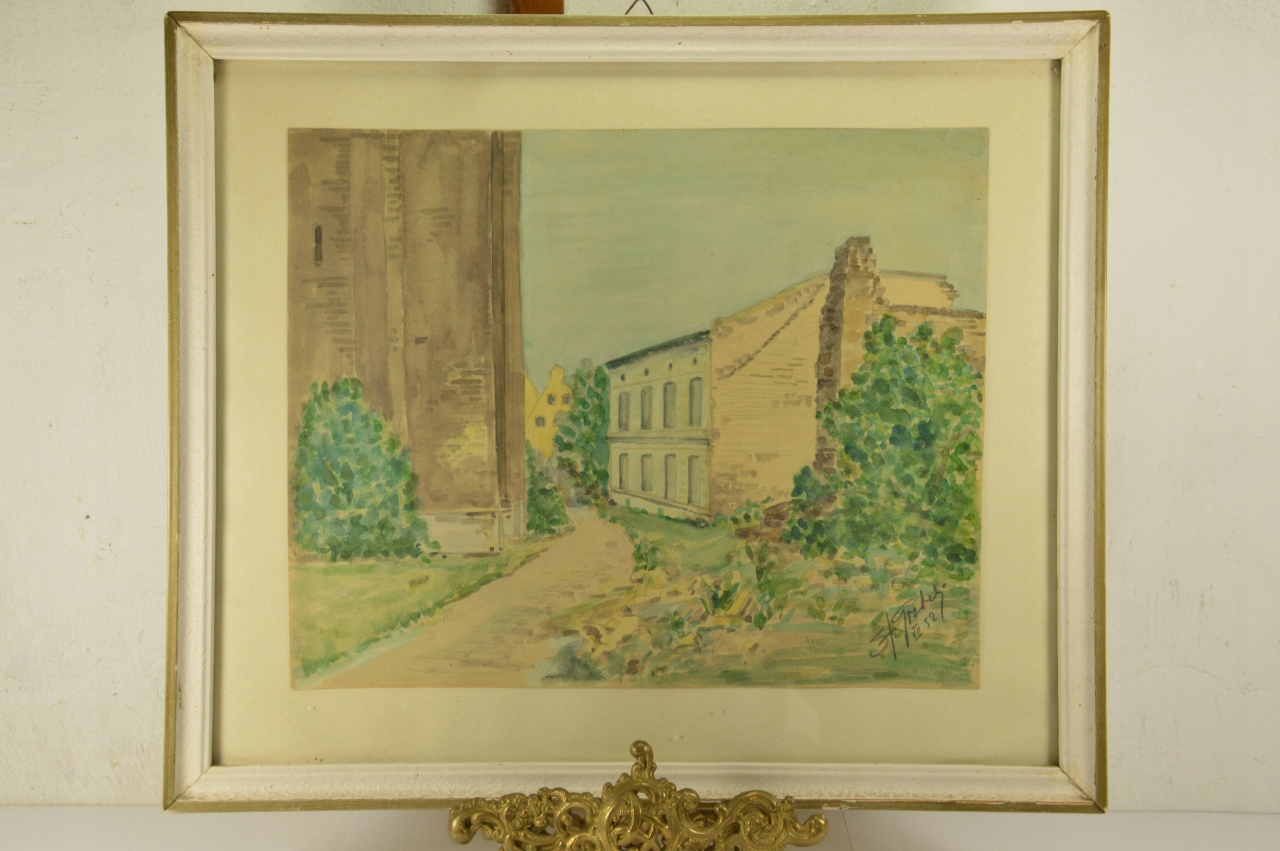 PIĘKNA SYGNOWANA AKWARELA OBRAZ PEJZAŻ MIEJSKI 1952 r. ZOBACZ!