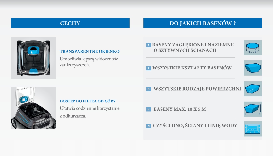 - Запатентована функція циклонічного всмоктування забезпечує тривалий і оптимально інтенсивний збір бруду. Нові профільовані спіральні щітки та двоступенева прогресивна фільтрація дозволяють ефективніше збирати навіть найменший бруд.З пилососом CNX20 басейн буде чистим цілий рік. ul>