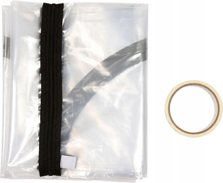 Пилозахисний чохол на дверні прорізи з щільної, безбарвної, прозорої поліетиленової плівки. Розпірна частина має П-подібну форму і відкривається на вшиту блискавку з одним бігунком. Фольга кріпиться за допомогою скотчу.