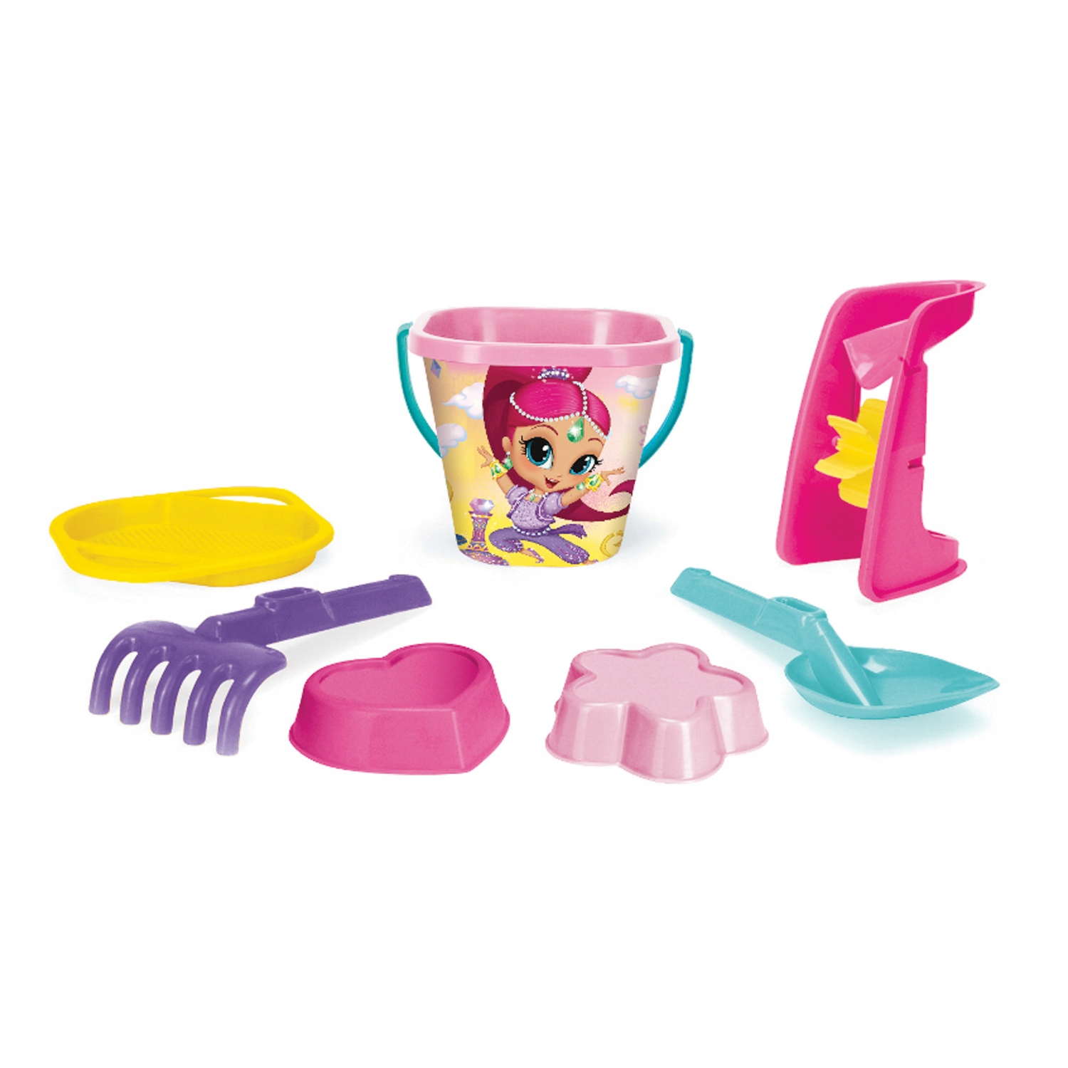 Набір піску з Shimmer & Shine, що складається з 7 елементів у рожево-фіолетових кольорах, сподобається всім коханцям творчої гри на піску. Комплект включає: квадратне відро, плече, грабки, ситечко, шліфувальна машина та 2 форми. Окремі елементи мають цікаву графіку, виготовлену за методом IML. Завдяки цьому він витримає контакт з водою та сонцем. Весь виготовлений з нетоксичних, безпечних та довговічних матеріалів.