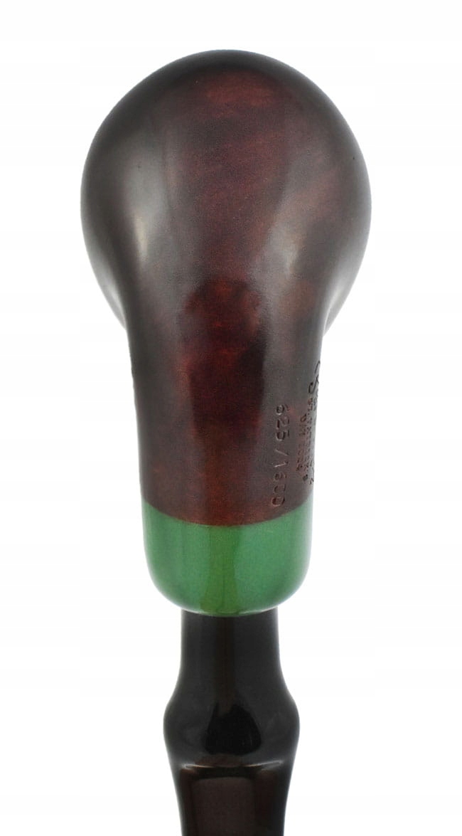 Труба сильно вигнутої форми. Насадка гладка і має обробку з червоного дерева з більш світлими відблисками, що підкреслюють природну текстуру. Шийка закінчується широким смарагдово-зеленим кільцем. Попередньо навуглений димохід вміщає середню кількість вашого улюбленого тютюну. Горловина підписана фірмовим логотипом, номером моделі та найменуванням, індивідуальним, колекційним номером трубки - гарантія оригінальності. Акриловий мундштук має інноваційний наконечник P-Lip, який спрямовує дим під час паління прямо до смаку. Чудова ідея для несподіваного подарунка.