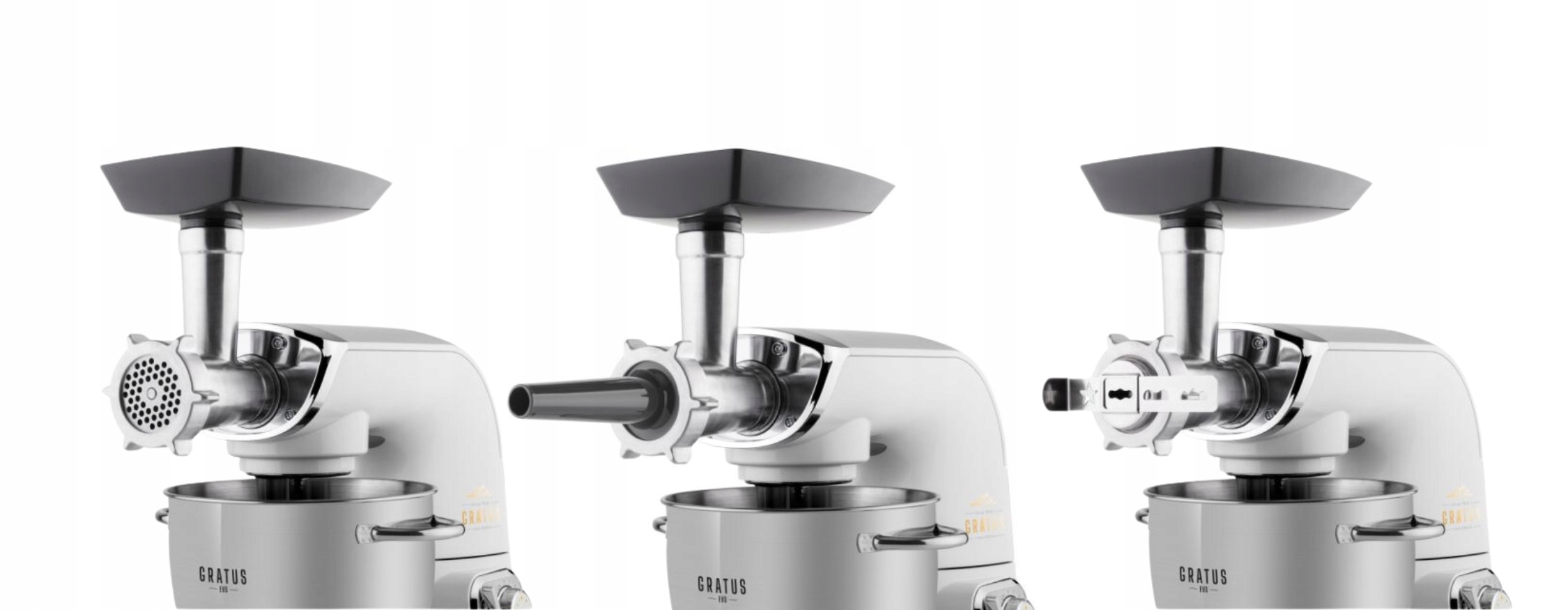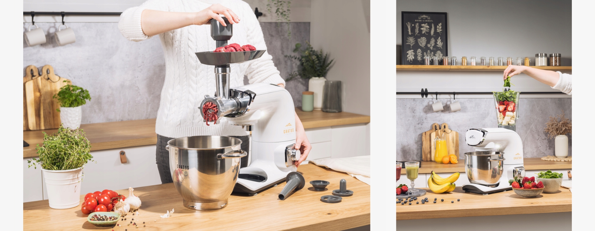 Ніщо не може замінити свіжозмелене м'ясо, тому ми оснастили ETA Gratus EVO Max м'ясорубкою діаметром 62 мм із трьома розмірами шліфувальних дисків для тонкого, середнього та грубого помелу. Завдяки цьому ви легко зможете приготувати домашні бургери або свіжий стейк тартар. Також є насадка для приготування нарізок, фрикадельок Кеббе та формочок для печива.