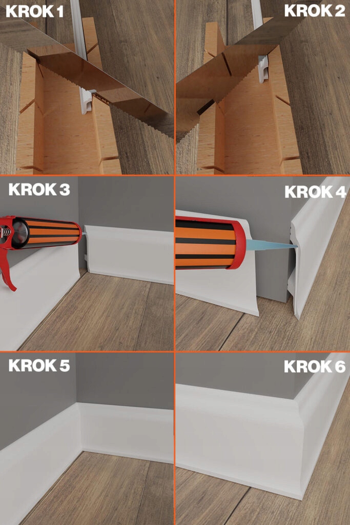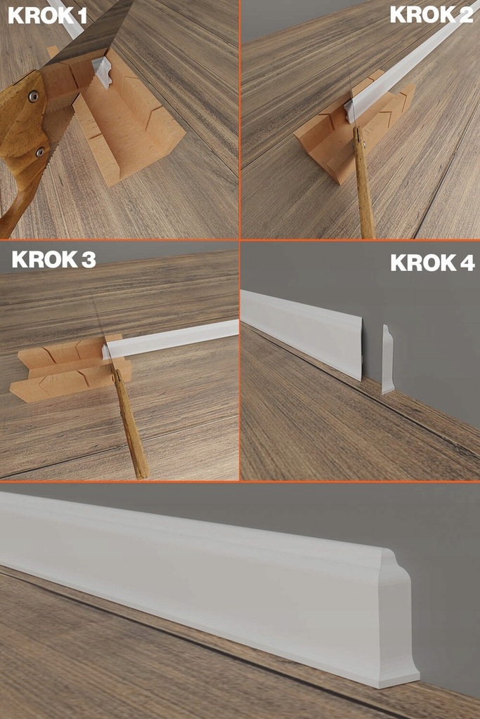Крок 5 і 6 показує правильно виготовлені куточки. Для того, щоб отримати ідеальні суглоби, рекомендуємо використовувати пилу з дуже маленькими зубами, якщо ми розрізаємо смужки в поріжках. Якщо ми використовуємо діагональну пилку, рекомендуємо використовувати пластиковий щит.