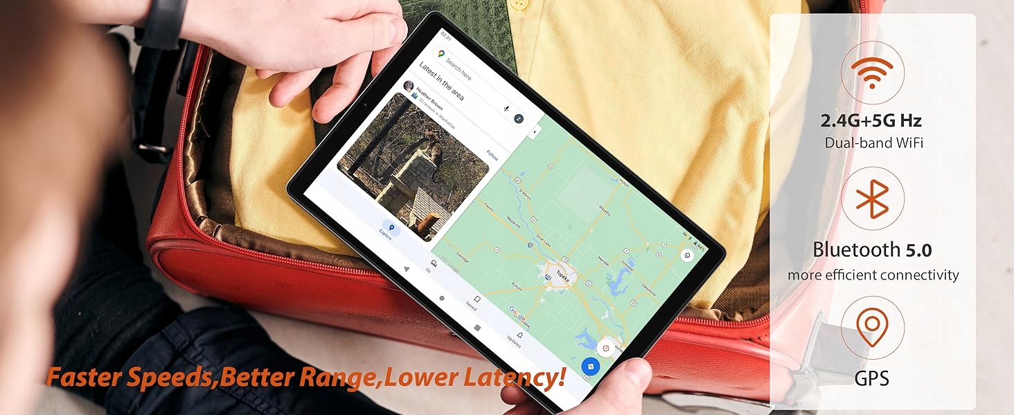 Тонка конструкція змушує пальці ковзати природним чином і комфортно, завдяки якому вони менш сприйнятливі до відбитків пальців та подряпин. Прийнявши 10,1-дюймовий екран високої роздільної здатності 1920x1200, з високою роздільною здатністю, яскравими та яскравими зображеннями, відмінним контрастом та чистотою, може захистити зір та безпечно використовуватись дітьми. Дуже швидка Wi-Fi 802.11 A/B/G/N/AC (підтримуючи 2,4 ГГц/5 ГГц Wi-Fi) та технологія Bluetooth 5.0 забезпечують більшу мобільність.