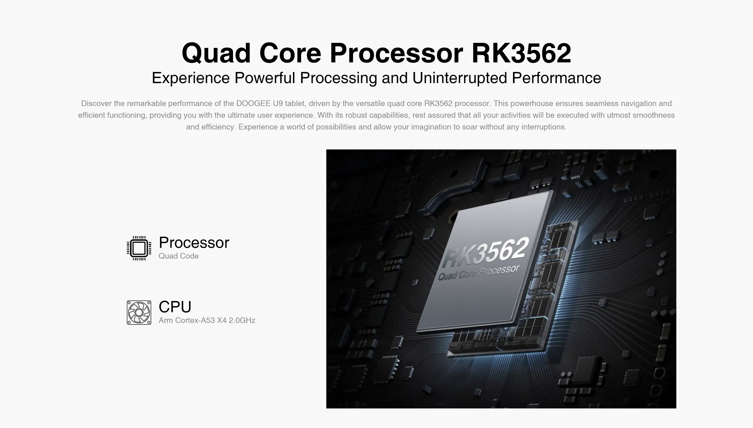 Планшет DOOGEE U9 оснащений чотирьохядерним процесором RK3562, який забезпечує чудові можливості обробки та плавну багатозадачність. Незалежно від того, чи це важкі додатки, чи щоденне використання, стабільна продуктивність дозволяє легко впоратися з цим і насолоджуватися ефективною роботою та іграми.