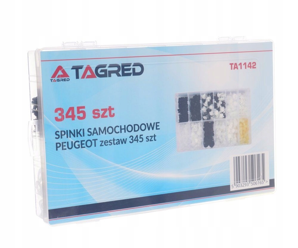 Набір пластикових кліпів, кліпів та боїв автомобілів Peugeot. Пакет містить 12 типів, загалом 345 штук. Ціле упаковане в пластикову коробку з практичними відсіками.
