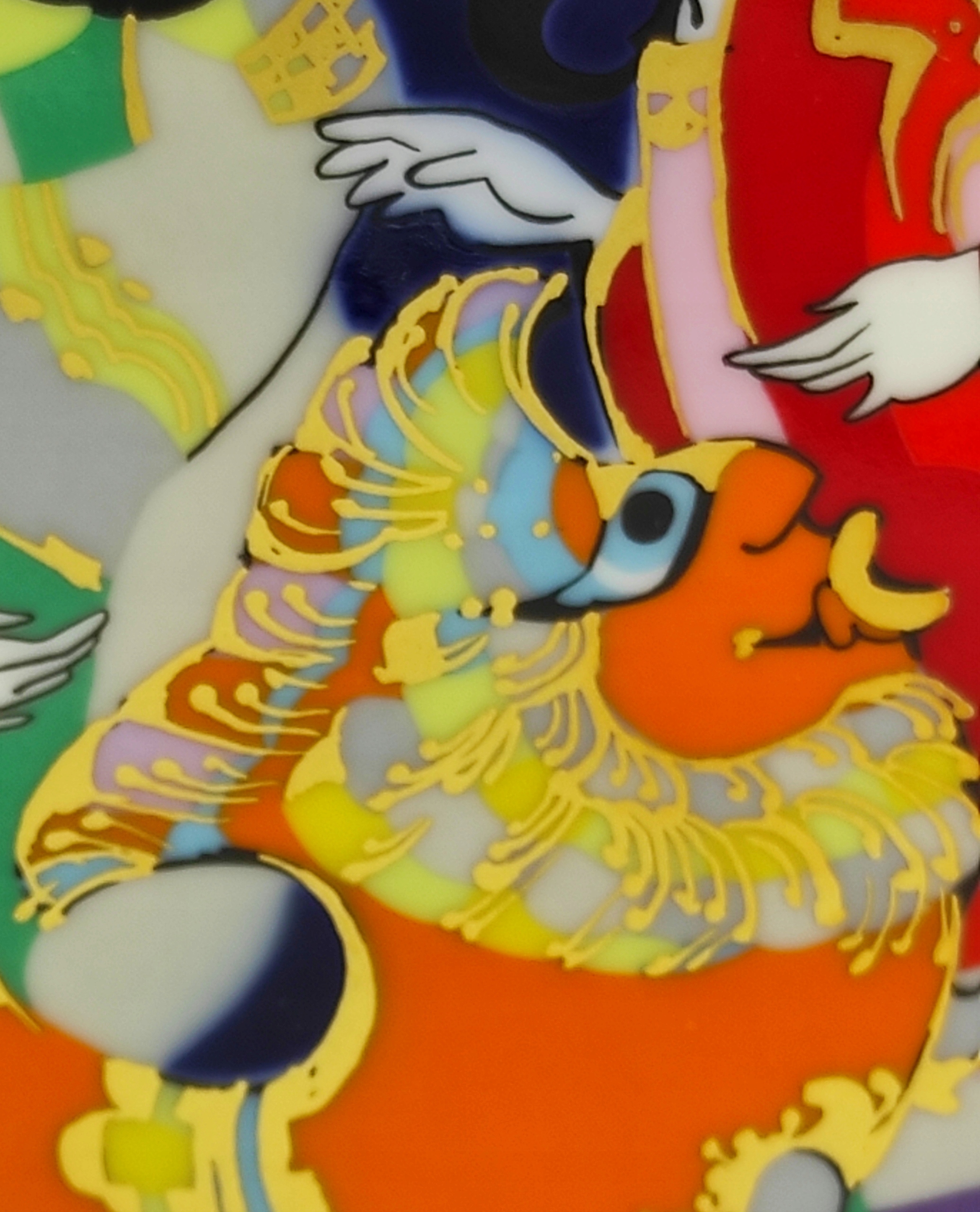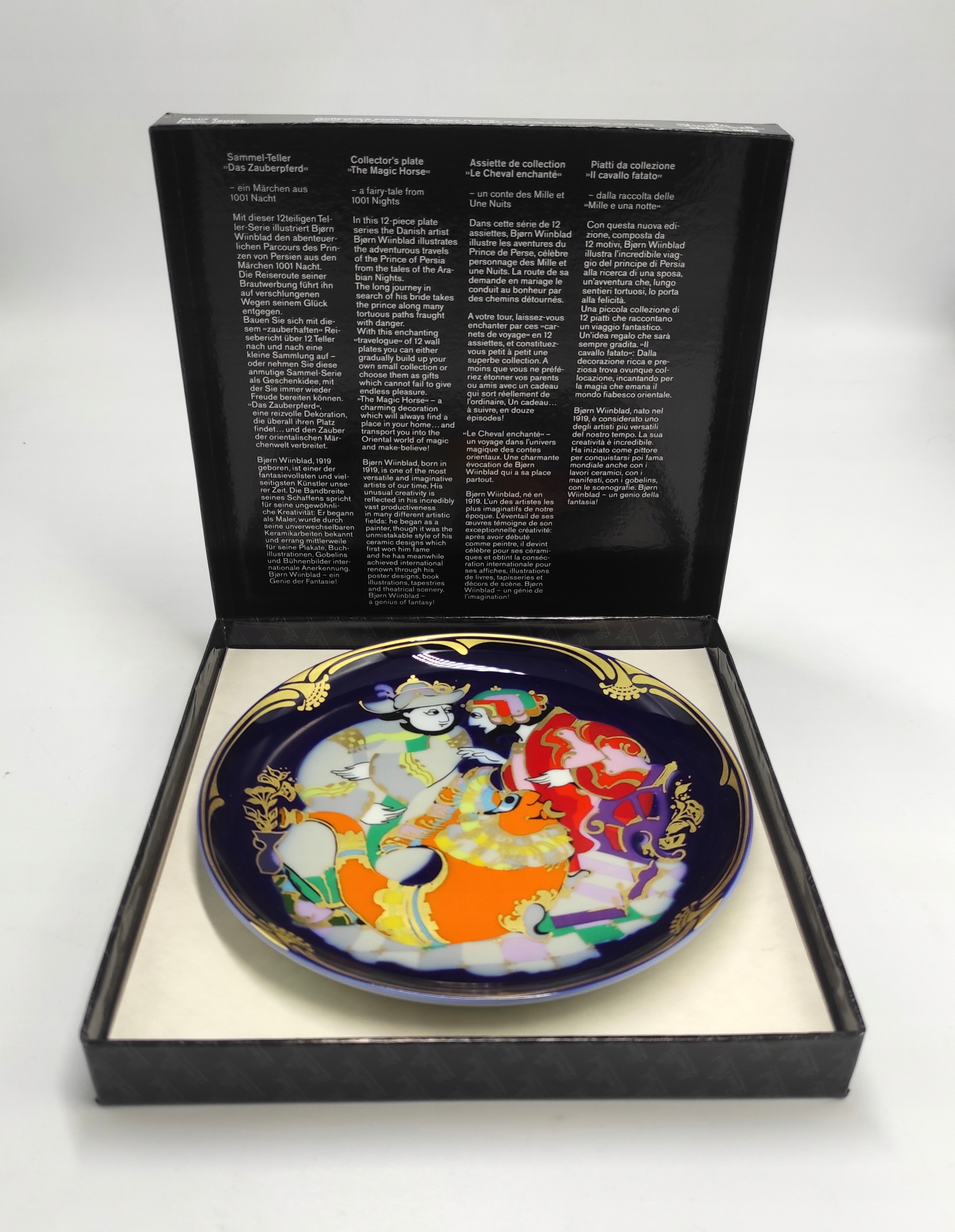 Тарілка з колекції «ЗАЧАРОВАНИЙ КІНЬ» з казки «Тисяча і одна ніч» під номером 2. Виготовлена з порцеляни найвищої якості та прикрашена декором у чудових кольорах. Пофарбована в глибокий кобальтовий синій колір з красивою позолотою та казковим мотивом. Позолота фантастично гармонує з сильними, яскравими кольорами та чудово відбиває світло, якщо дивитися під прямим кутом. Бьорн Війнблад – датський художник, який ставить фантазію вище простоти та здорового глузду, що чітко видно в його казкових дизайнах, якими він дуже відомий.