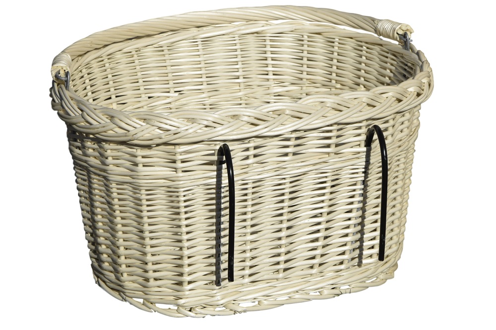 Велосипедний кошик з гачками З БІЛОГО ПЛЕТЕННЯ (БІЛИЙ З М'ЯКИМ ЕКРЮ) -ідеально підходить для велосипедних прогулянок, шопінгу, для перенесення собаки чи кота. Дуже міцна конструкція забезпечує безпечне та зручне перенесення покупок. Кошик розміщується на передній частині керма за допомогою відповідно зігнутих металевих стрижнів, захищених спеціальним пластиком