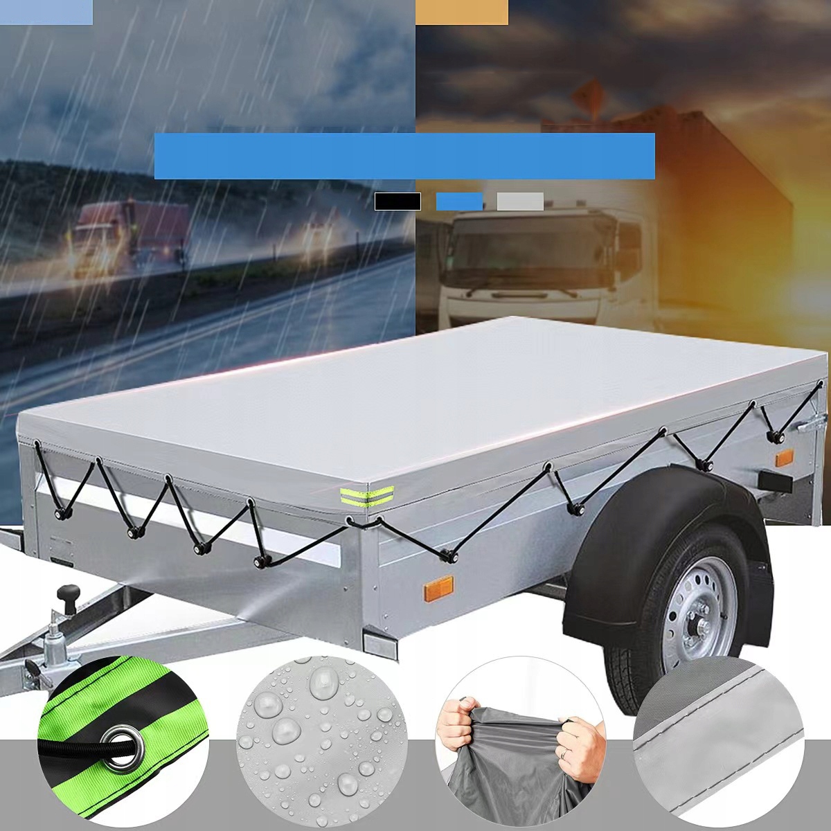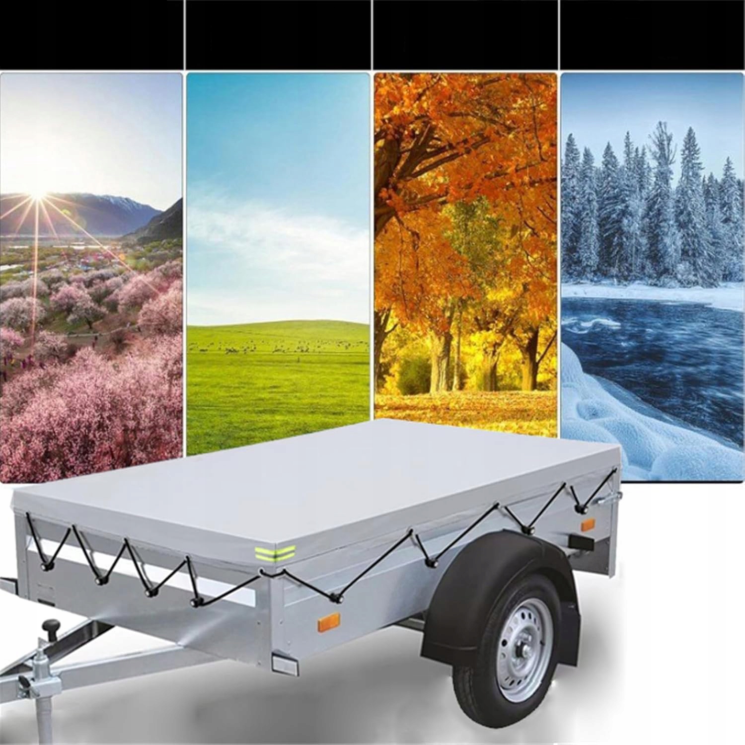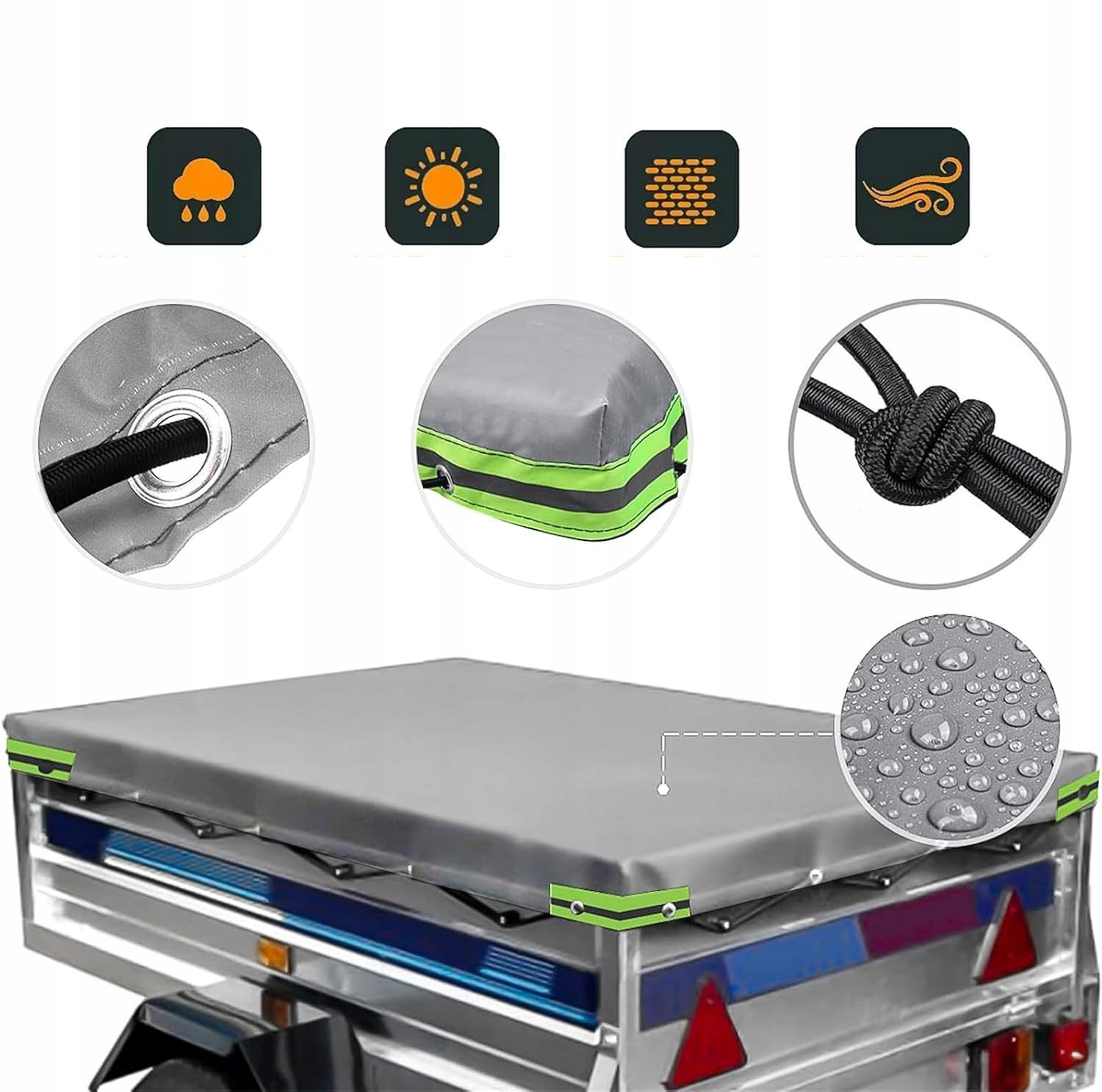 ✅✅ 【Преміум -матеріал】 Плоский брезент виготовлений з міцного матеріалу Oxford 420D, який стійкий до розриву. Забезпечує захист від води, снігу, пилу та сонячного світла. і захищена, і вода не потрапляє в причіп, коли йде дощ. Крім того, відбиваючі смуги в кутах забезпечують більшу безпеку вночі. У куточках брезенту. Усі шви та краї були зміцнені та складні при високій температурі, що перетворюється на високу міцність і надзвичайну стійкість до погодних умов. твердий і стабільний. Завдяки гумової стрічки, кришка причепа може бути легко прикріплена до відповідного трейлера. Для причепів вантажопідйомність 500 кг або 750 кг. 4