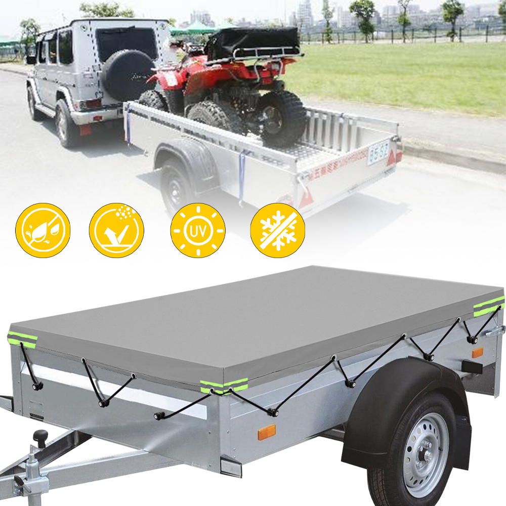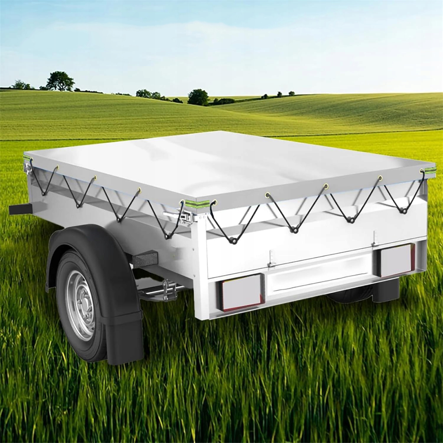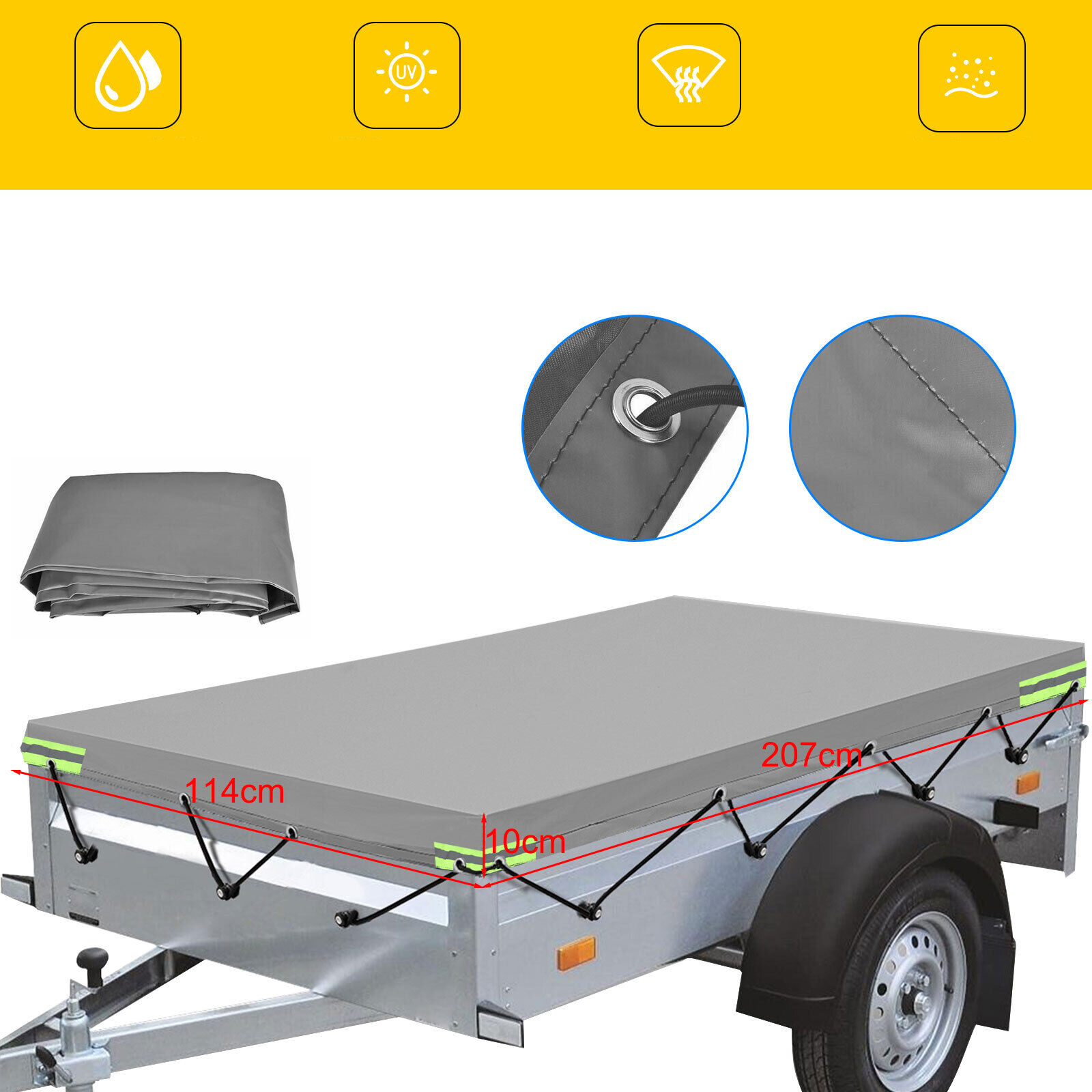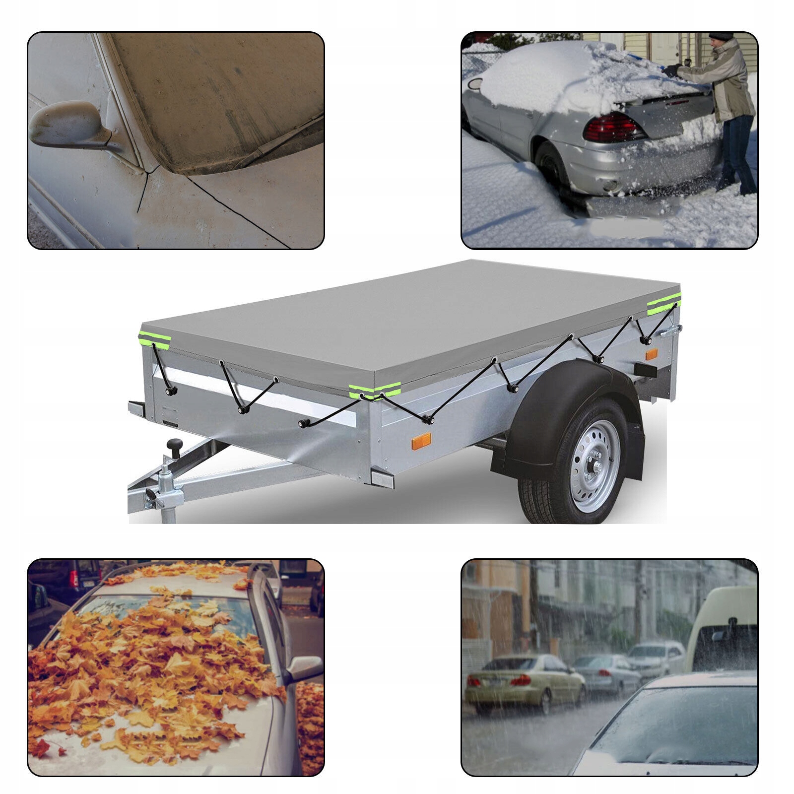 ✅✅ 【Преміум -матеріал】 Плоский брезент виготовлений з міцного матеріалу Oxford 420D, який стійкий до розриву. Забезпечує захист від води, снігу, пилу та сонячного світла. і захищена, і вода не потрапляє в причіп, коли йде дощ. Крім того, відбиваючі смуги в кутах забезпечують більшу безпеку вночі. У куточках брезенту. Усі шви та краї були зміцнені та складні при високій температурі, що перетворюється на високу міцність і надзвичайну стійкість до погодних умов. твердий і стабільний. Завдяки гумової стрічки, кришка причепа може бути легко прикріплена до відповідного трейлера. Для причепів вантажопідйомність 500 кг або 750 кг. 4