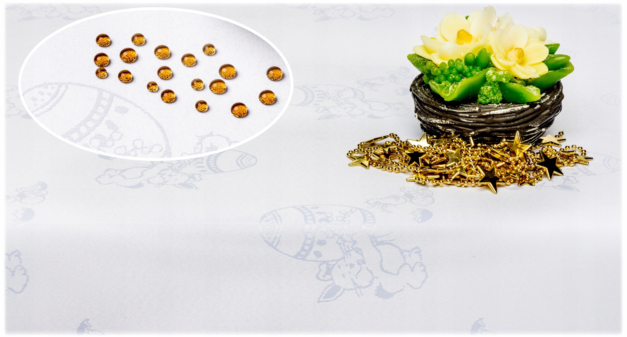 Поверхня скатертини утворює характерні краплі, які можна легко видалити паперовим рушником або сухою тканиною.