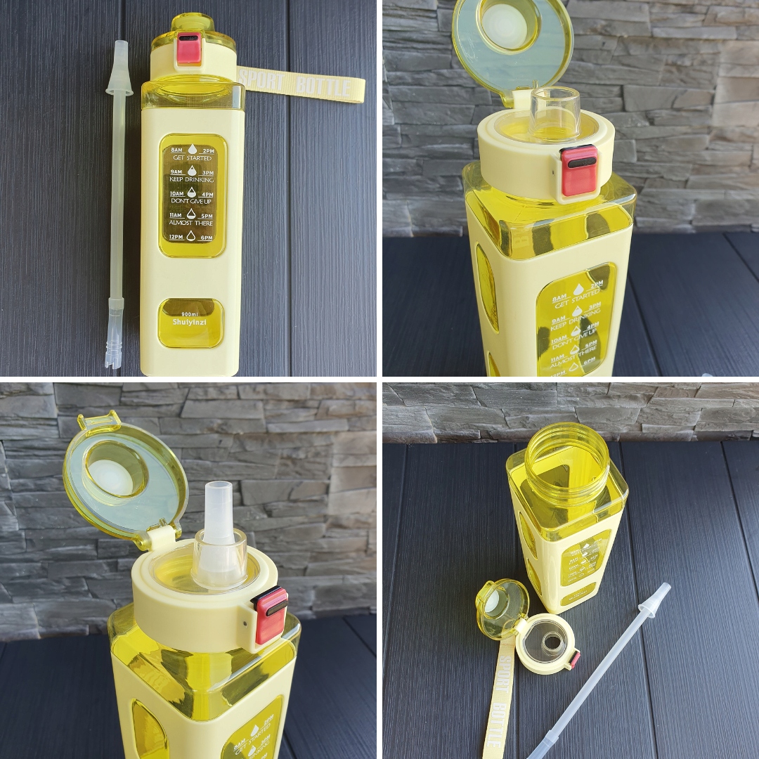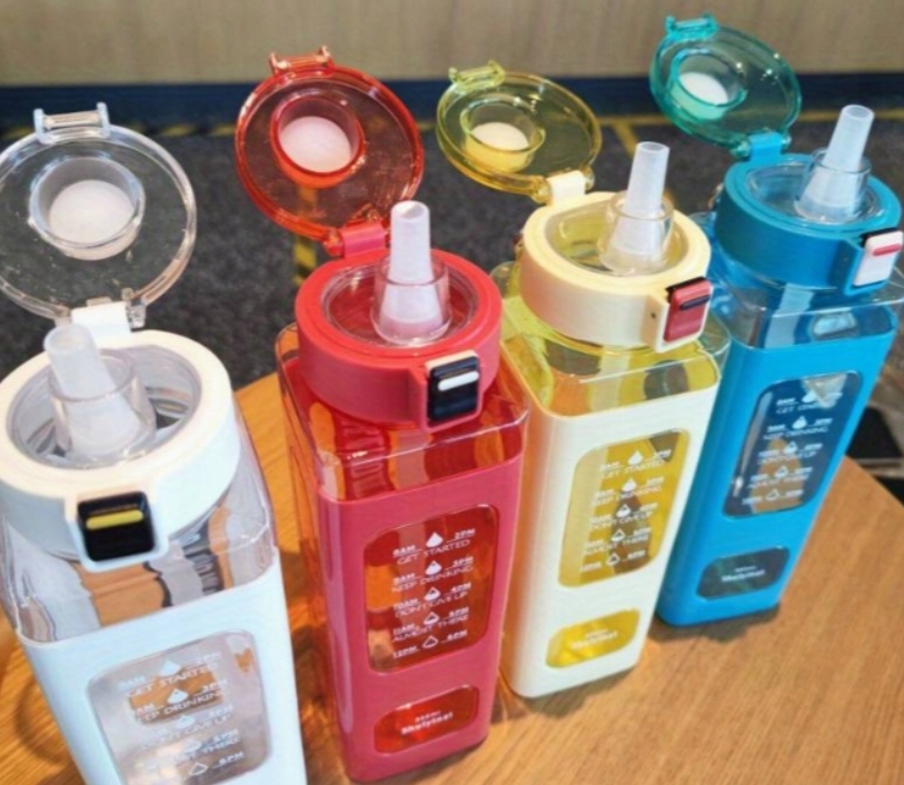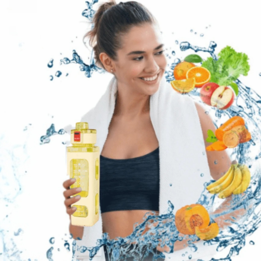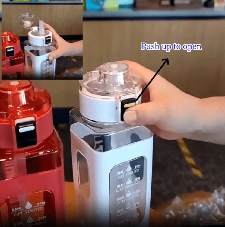 - На пляшці є мірна чашка, яка вказує на кількість випитої води.