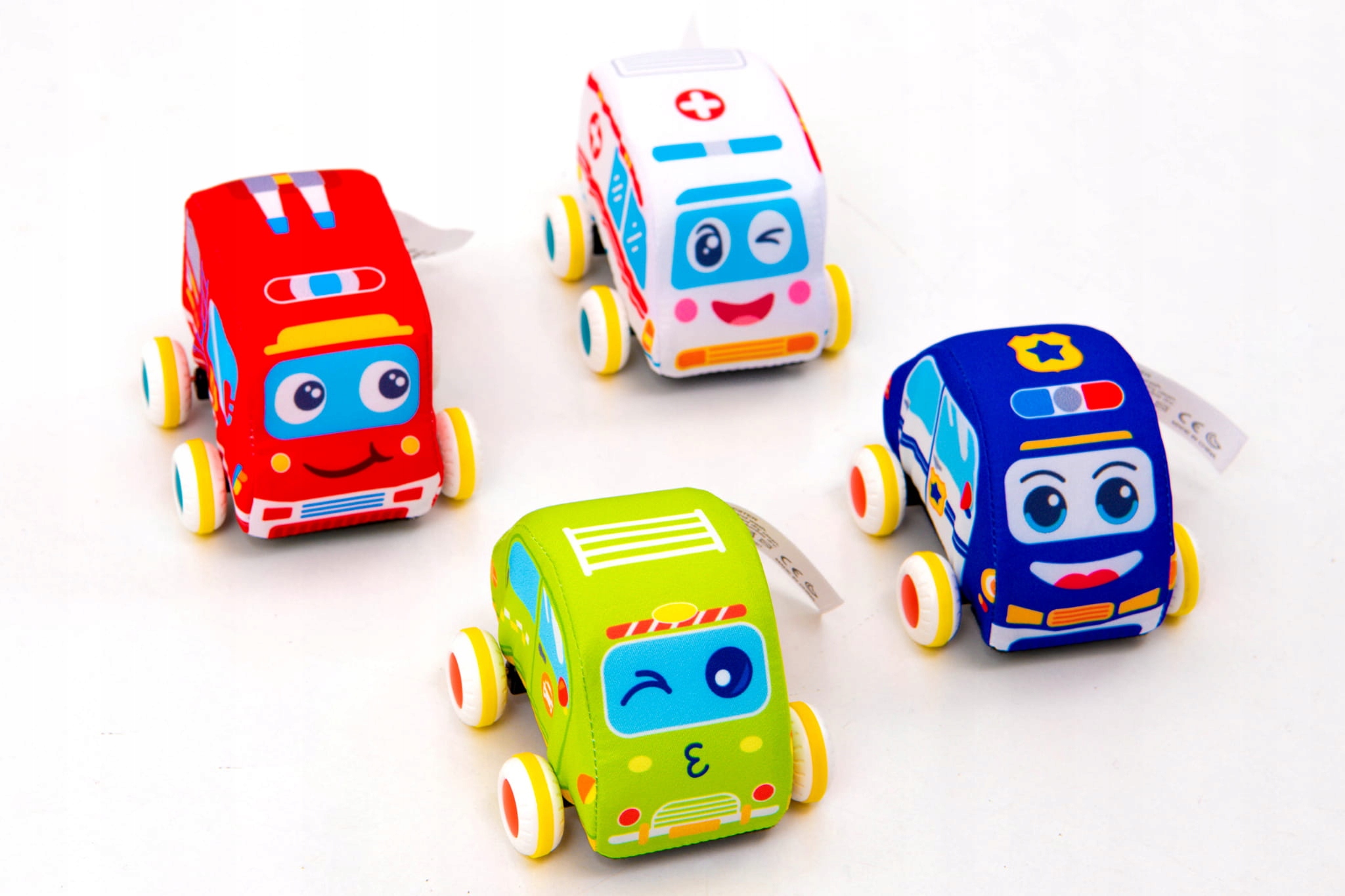 Набір містить чотири м'які машини: пожежна команда, поліцейська машина, швидка допомога та таксі, кожен з них розроблений з увагою до деталей для відтворення різних транспортних засобів для порятунку та обслуговування. і приємний на дотик , що робить їх ідеальними супутниками гри навіть для наймолодших.
