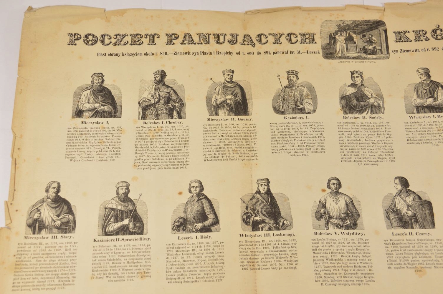 Оригінальна велика графіка 19-го століття «Кількість правлячих королів Польщі». Видано книгарнею Олександра Новолецького у Варшаві. Надруковано Я. Яворським у 1862 р. Дуже рідкісне видання з першими малюнками/графіками образів польських королів, опубліковане у 1862 р., за 30 років до творів Матейка. Унікальна річ великого формату, чорнильні плями на згинах, потерті краї. Загальний стан добре видно на фотографіях в описі аукціону.