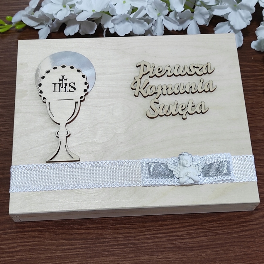 - На коробці зверху є напис, вирізаний з фанери: Перший Святе Причастя, чаша IHS , джутова стрічка з бантиком і гіпсовий янгол