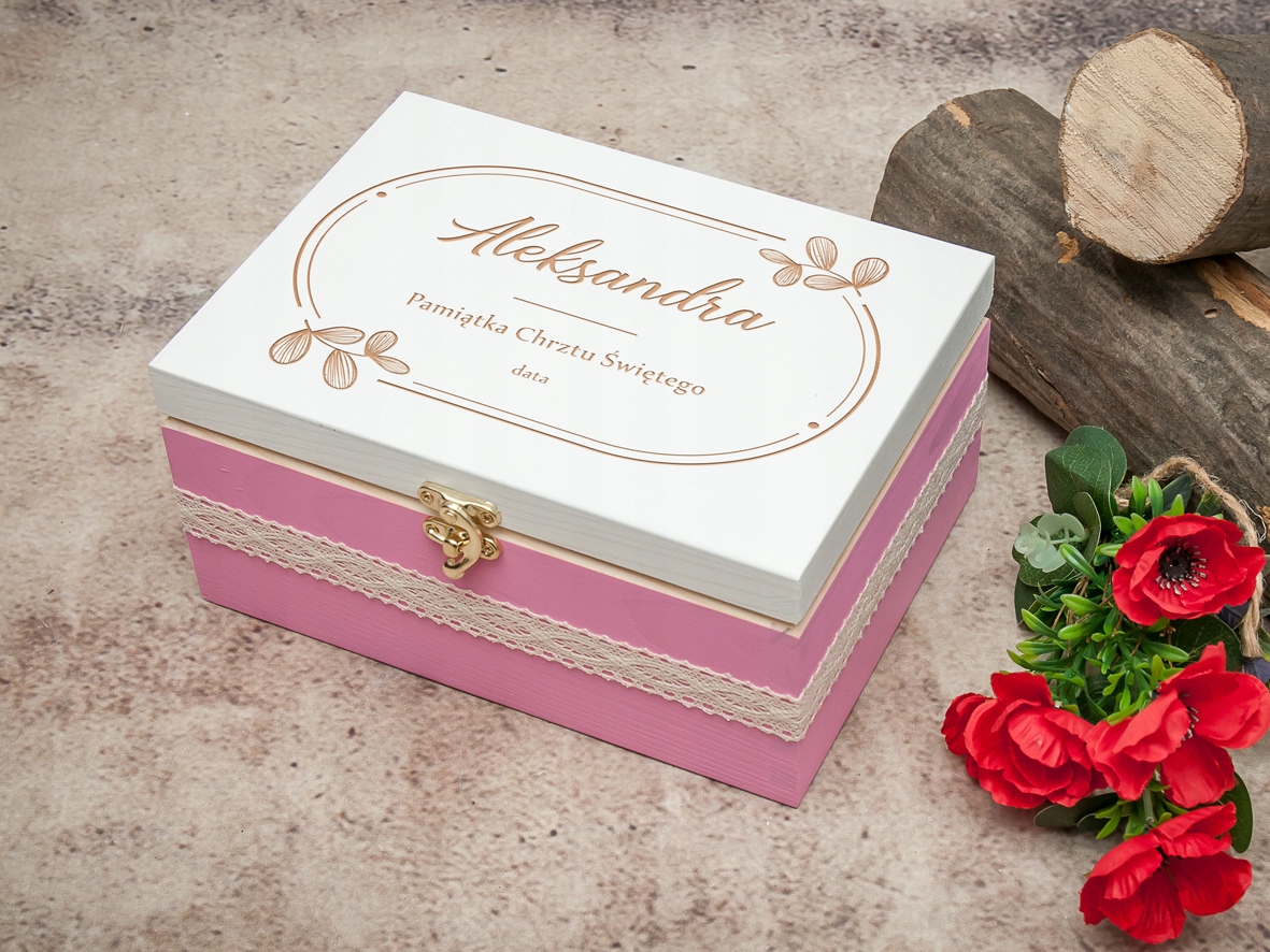 Дерев'яна коробка - подарункова коробка з гравіюванням імені з нагоди хрещення.