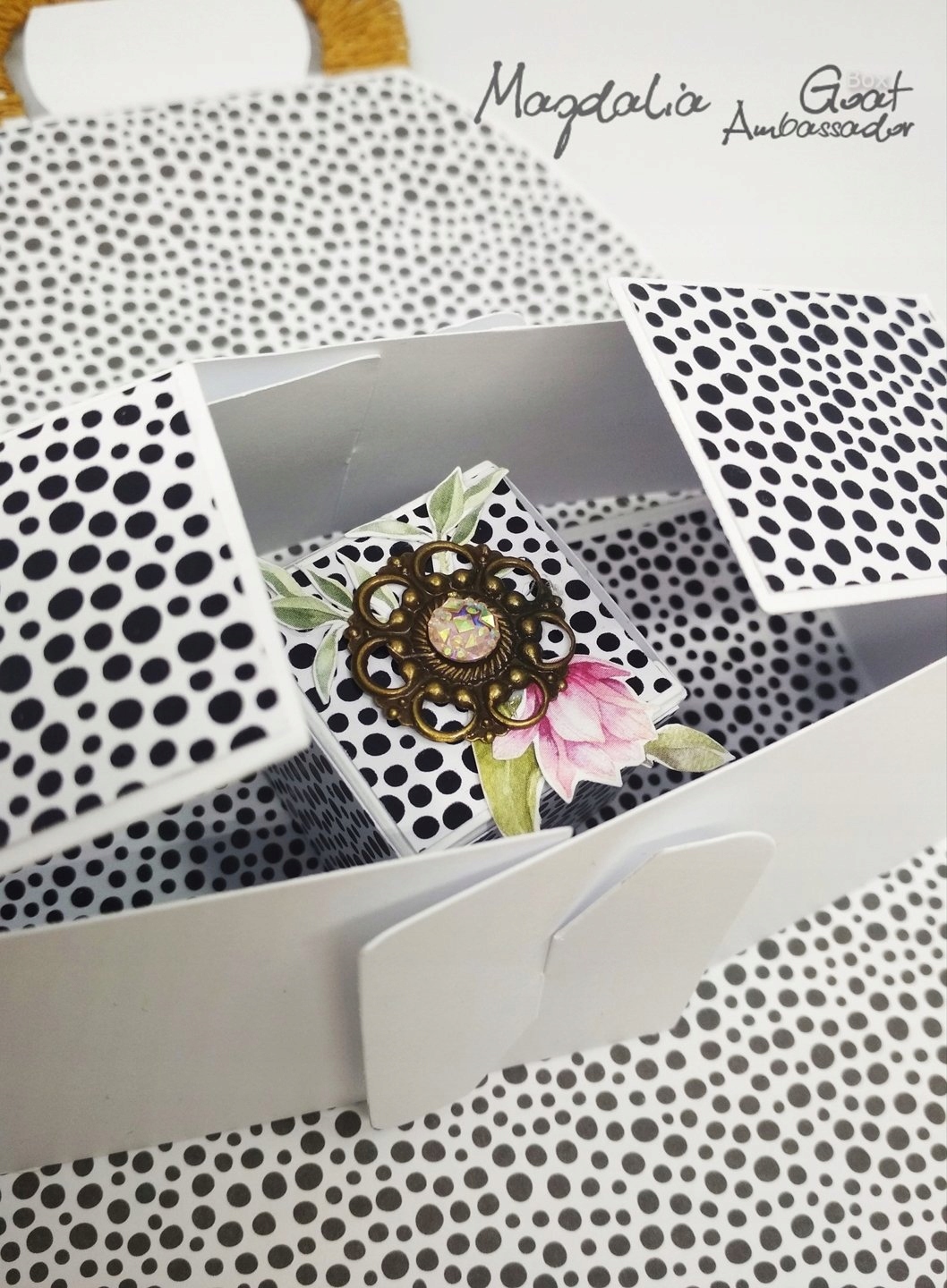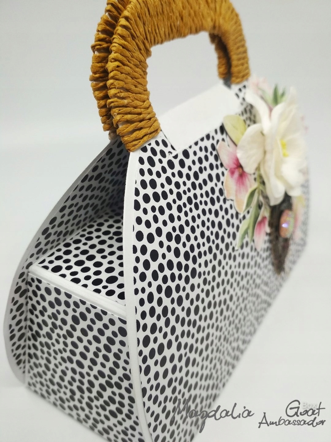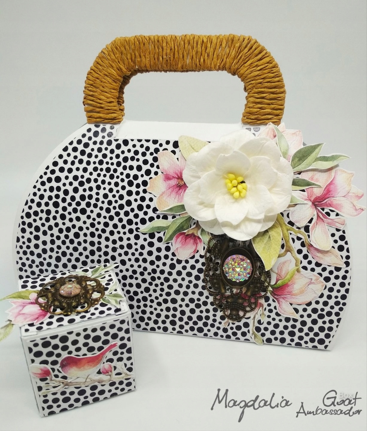 Коробка у формі вишуканої сумочки з ручкою та застібкою, не відкривається автоматично.