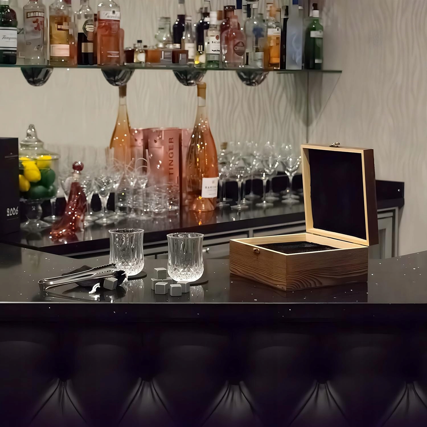 - Комплектація: після покупки ви отримаєте 2 склянки для віскі в круглій оправі, 8 гранітних щипців для віскі, 1 оксамитовий пакет для віскі, 2 підставки для віскі, 1 сталевий щипчик. та 1 дерев'яний ящик для зберігання та транспортування всього набору.