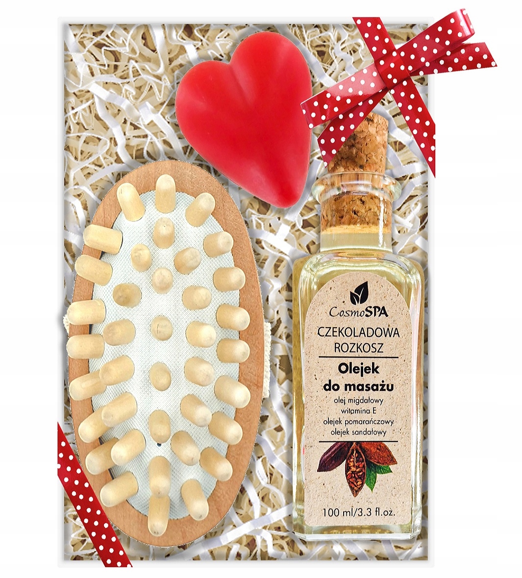 У набір входить натуральна шоколадна масажна олія в оригінальній скляній пляшці з пробкою. , масажер, що полегшує масаж, і ароматне мило у формі сердечка.