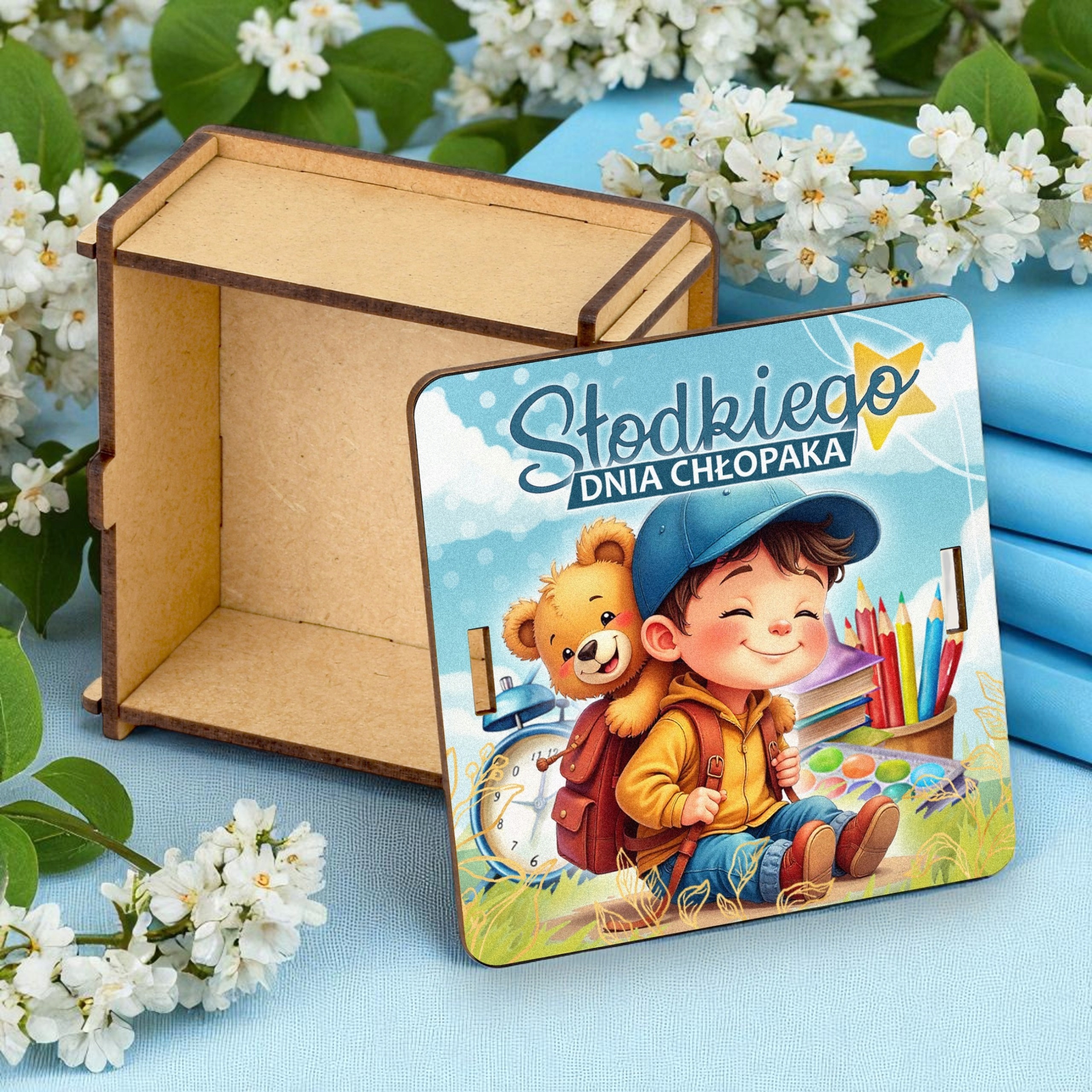 День хлопчика - ідеальна можливість відсвяткувати енергію та радість, яка перекидається як у маленьких, так і у великих хлопців! Дерев’яна коробка з барвистим принтом унікальна та міцна сувенір, яка буде нагадувати вам про посмішку та велику забаву щодня.