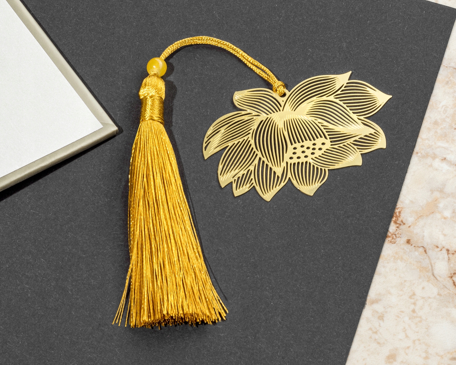 Дуже елегантна і стильна закладка в класичному золотому кольорі та повна символіка квітки лотоса, яка протягом багатьох століть має дуже важливу символіку. Існує багато прихованих значень, які роблять його і загадковим, і красивим. Квітка Лотоса вже давно є символом сили, краси та благодаті, містики, але також чистоти, оскільки вона росте бездоганно від грязі, вірності, любові та просвітлення. Унікальний подарунок, наповнений символами для спеціальної людини.